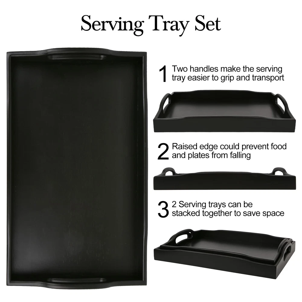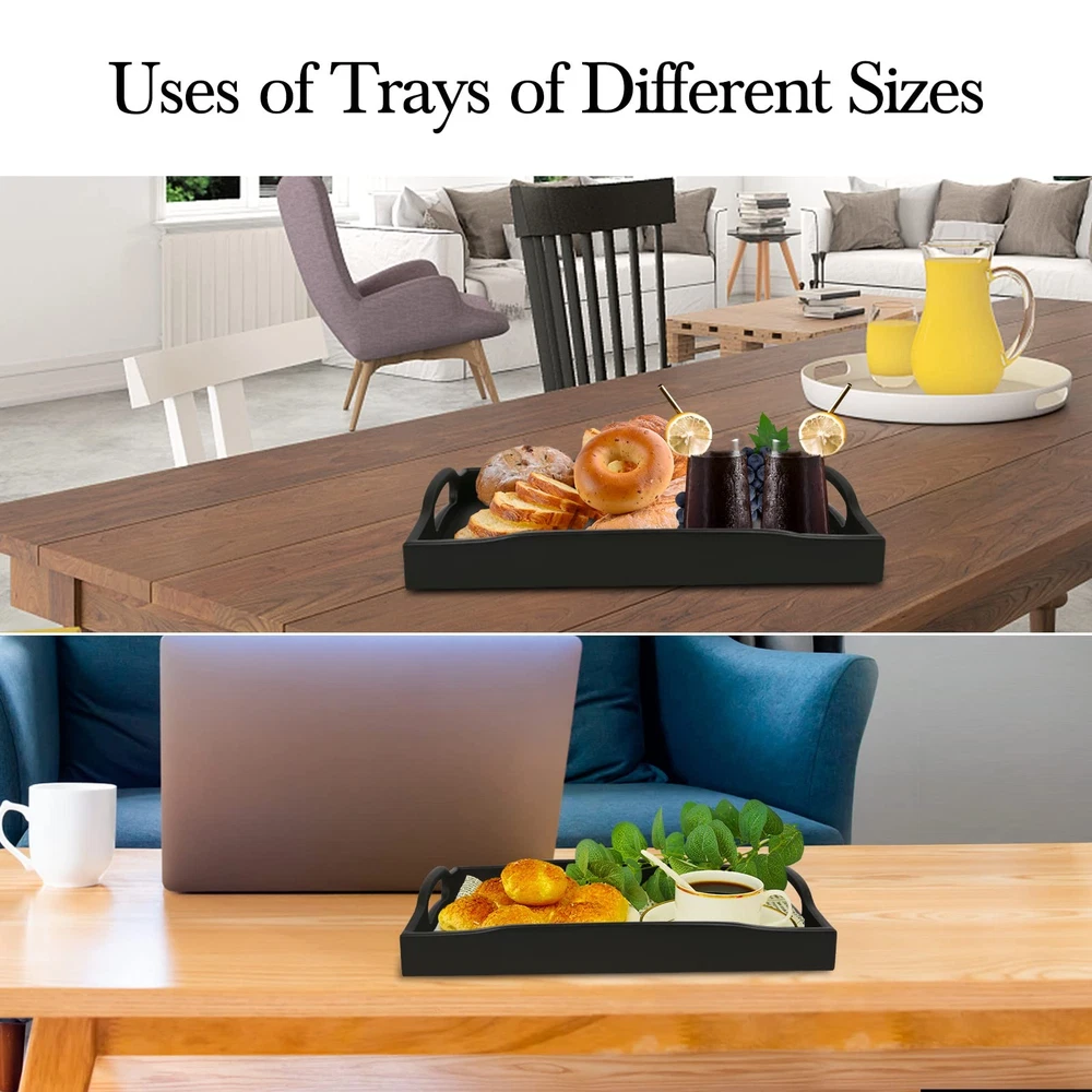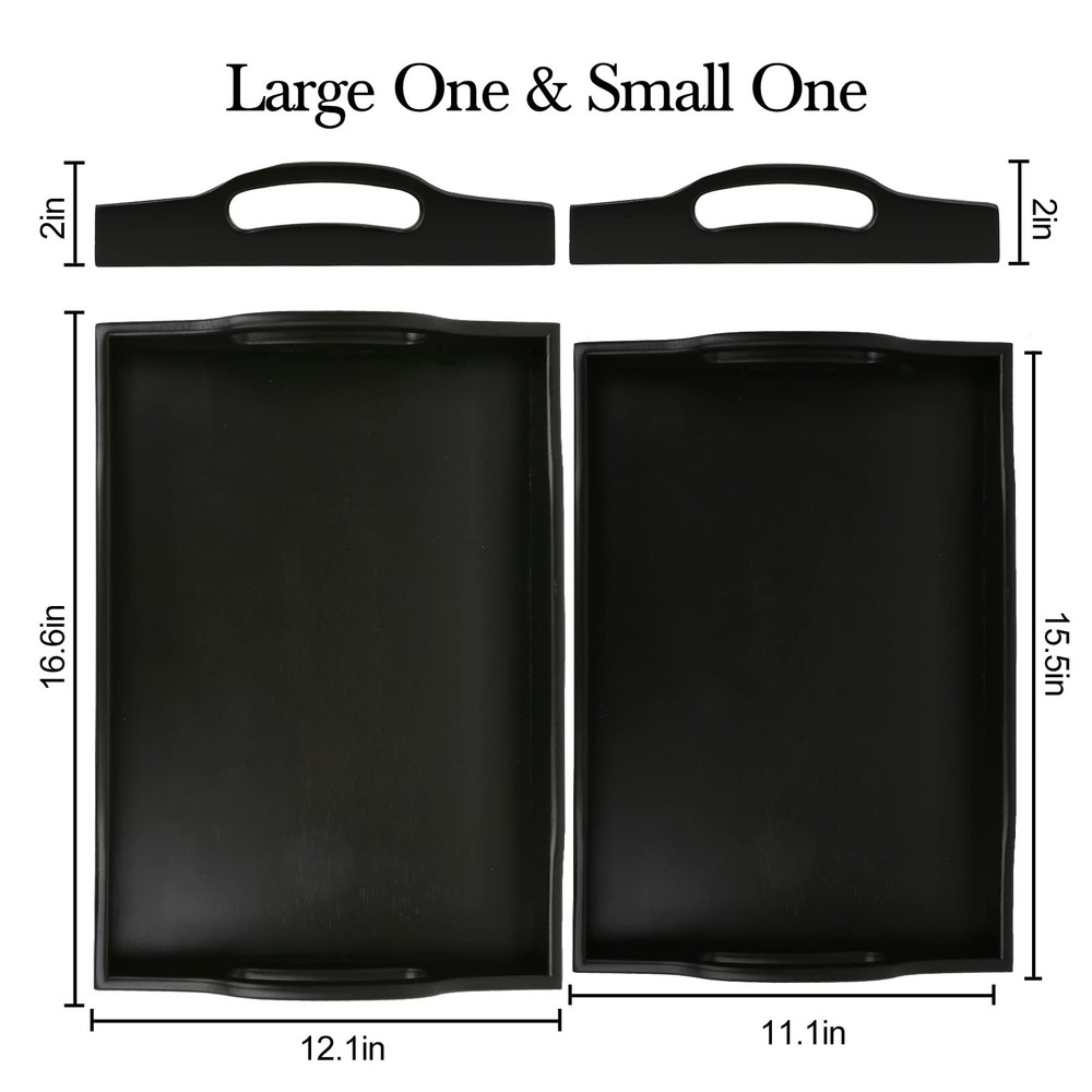 Our tray with handles are sturdy and beautiful. You can keep snack tray in your living room, kitchen, bedroom, bathroom. These black serving trays are crafted from bamboo and will help you do the tasks you need. Use ottoman tray to serve snacks fruits breakfast in bed tray at hotels bars or coffee shops. Our cosmetics Decorative tray are also for jewelry, remote, glasses, ornaments, magazines. Two large handles design not only looks beautiful,but also makes Large Wooden Tray more easy to grip and transport; raised edge could prevent food and plates from falling. You can put serving tray with handles on an bed, coffee table and couch. The easy arrangement food trays can put cups, plates, food, vegetables, sugar etc. As a room tray decor which saving a lot of space for your living room and kitchen. Comes with 2 sizes the large serving tray 16.5X12.2X 2 inches and small tray 15.5X11.2X 2 inches. The beautiful kitchen tray serve food and beverages or for decorating living rooms. The versatile and practical uses make bamboo tray a great gift for anyone; You can put black coffee table Tray using restaurants, office, party, wedding, Indoor & Outdoor.