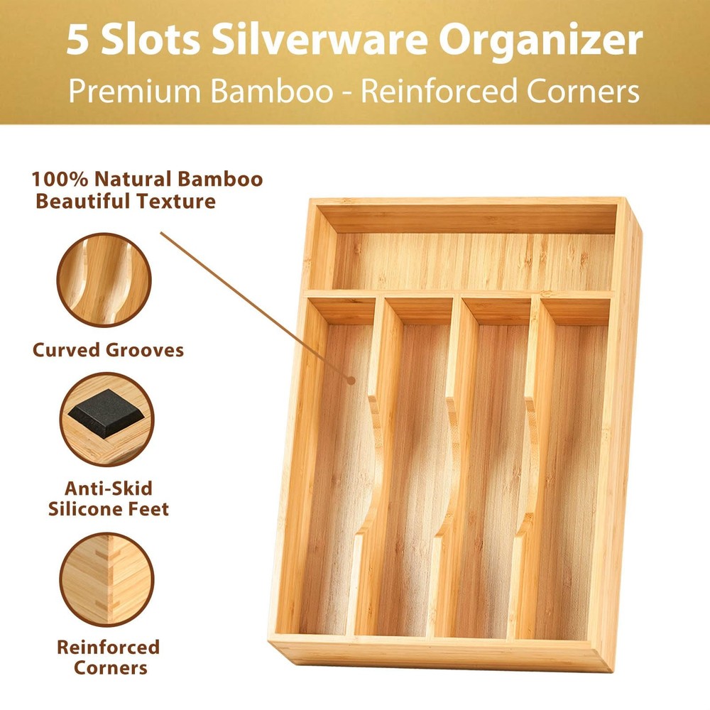 5 Slots Kitchen Silverware Organizer for 8.25" Wide Drawer PREMIUM BAMBOO: Drawer organizer made of organic bamboo (even the base), more sustainable, durable and classy than plastic. SOLID CONSTRUCTION: Strong frame, base and reinforced corners with mortise and tenon structure, this silverware organizer holds up much better and lasts longer than any plastic tray. Knives won't slide through dividers. PERFECT SIZE: Measures 8.25"W x 13"D x 1.9"H, ideal for standard small drawer. We highly recommend to measure your drawer before order. ANTI-SKID: 4 big silicone feet keep the bamboo tray immobile and quiet when pulling out and pushing back the drawer. EASY TO CLEAN: Wipe clean with a cloth dampened in a mild cleaner. Wipe dry with a clean cloth. Don’t put them in dishwasher. A GREAT GIFT IDEA.