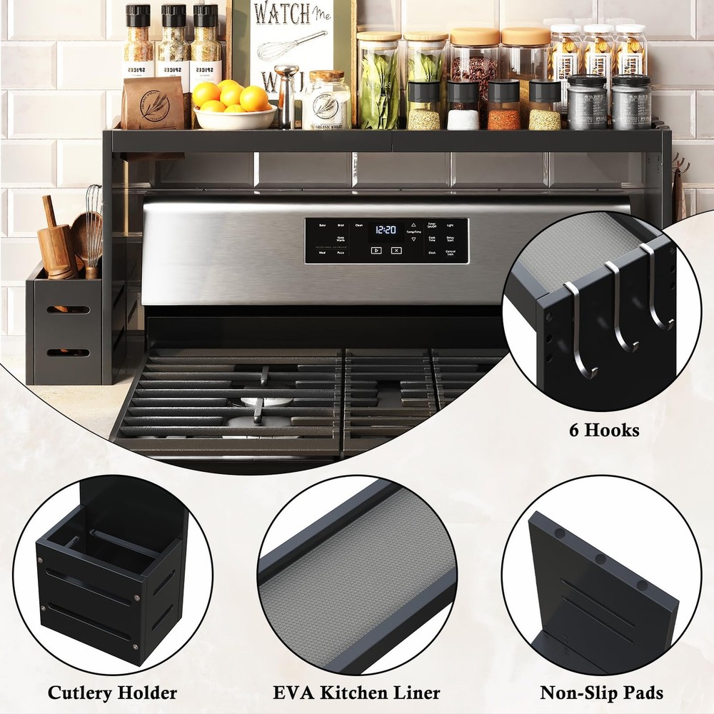 Bamboo Stove Shelf with EVA Kitchen Liner,31in Over The Stove Shelf,Cutlery Holder & 6 Hooks,For Back Of Stove Kitchen Storage stove shelf for back of stove over the stove shelf stove shelf stove top shelf over stove shelf over the stove spice rack oven shelf for top of stove above stove shelf over stove shelf for back of stove over the oven shelf oven shelf stove spice rack shelf magnetic stove top shelf spice shelf stove shelf for back of stove over the stove shelf Best Kitchen Stove Shelf Solutions: Our 31-inch Bamboo Stove sits securely over your stove,instantly adding premium storage space for spices, oils, and kitchen essentials – without stealing counter space! Features a built-in cutlery holder and 6 sturdy hooks for utensils, keeping everything within reach while cooking Secure And Stable Fit Design:This over the stove shelf features premium EVA kitchen anti-slip mats, providing exceptional grip and heat/oil resistance for your countertop surface. The non-slip pads on the bottom enhance stability, ensuring the rack and its contents stay firmly in place. Safety First! Durable Stylish & Easy Clean: Stove shelf crafted from premium moisture-resistant bamboo,this stove shelf for the back of the stove adds modern style to your kitchen. Its smooth bamboo surface paired with EVA Kitchen Liner—just wipe with a damp cloth or mild detergent. Maintenance is a breeze! Easy Installation: Designed specifically for standard stove shelves,Assembly steps come with installation instructions to help you complete setup quickly. Trim the EVA Kitchen Mat to your ideal size to protect countertops, install hooks and the Cutlery Holder on the stove shelf, and start organizing! Ready to use in minutes. Premium Value & Satisfaction: More than just a shelf! Get the complete organization solution with included bamboo shelf, protective EVA liner, dedicated cutlery holder, and 6 hooks. Backed by our worry-free guarantee – if you're not completely satisfied, contact us for a solution