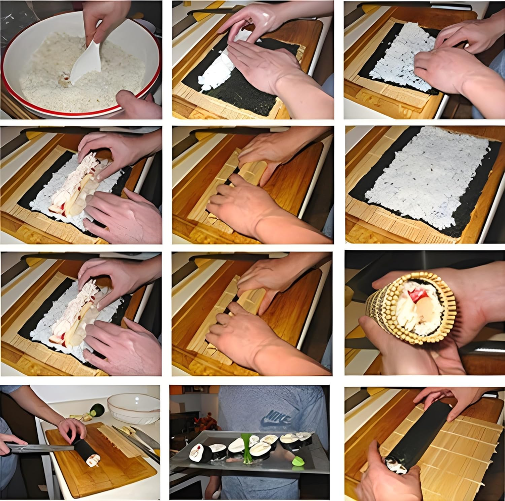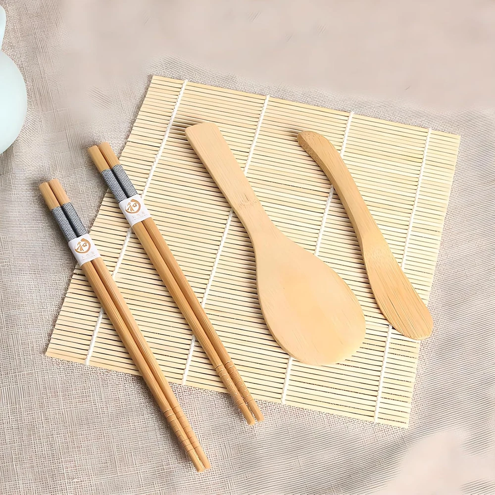 One set includes one mat,one paddle,one spreader,two pairs of chopsticks and one bag Size of the mat:9-1/2-Inch High Quality of all the parts Natural:these are made of natural bamboo.Enjoy the natural life! It is a MUST-HAVE set for sushi fans This set of sushi kit is a nice kit for beginners