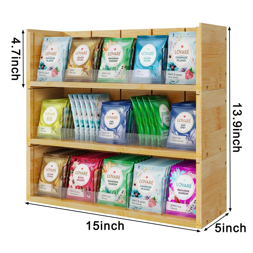 Bamboo Tea Bag Organizer Storage Box, 3 Tier Stackable Tea Bag Box Natural Wo...