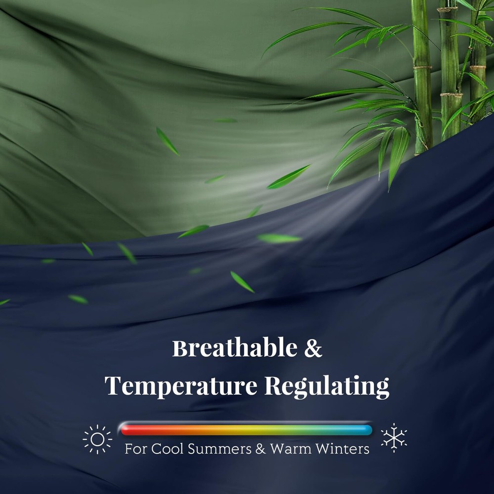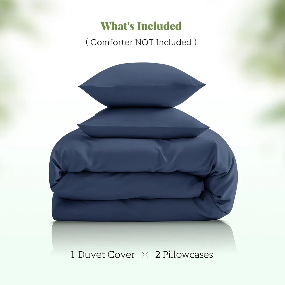 Discover our viscose derived from bamboo Duvet Cover Set, perfect for hot sleepers and all seasons. Moisture-wicking and breathable, it ensures a comfortable night's sleep. Features corner ties and a zipper for easy comforter insertion. Durable and fade-resistant, it's the ideal bedding upgrade. ORGANICALLY GROWN & OEKO-TEX CERTIFIED: Our Duvet Cover Set is crafted from 100% VISCOSE DERIVED FROM BAMBOO, sourced from sustainably managed and organically grown farms. OEKO-TEX STANDARD 100 Certified, it is free from over 100 harmful substances, ensuring safety and health for you and your family. Always pure, never blended, and made with only the finest materials, our duvet cover offers the best quality available. Sleep better, sleep smarter. COOLING & BREATHABLE ALL NIGHT: Discover pure comfort and luxury with our duvet cover set. Our HOT SLEEPERS SHEETS are ideal for anyone who tends to sleep hot, experiences night sweats, or lives in a warm and humid climate. Viscose derived from bamboo is highly breathable, moisture-wicking, and thermoregulating, keeping you cozy and refreshed all year. You deserve the best sleep, and this set delivers! EASY INSTALLATION & SECURE FIT: These duvet covers, equipped with a hidden zipper and 6 loops (4 corners and 2 sides), offer easy installation and a secure fit. The envelope-style pillowcases make replacement a breeze, combining functionality with chic style. Say goodbye to the hassle and enjoy a seamless bedding experience. BUILT TO LAST & EASY CARE: The duvet cover and pillowcases are crafted with high-quality stitching for long-lasting durability. Enjoy easy care with cold water washing, while experiencing a silky touch that grows softer and more luxurious with every wash. 3-PIECE FULL/QUEEN DUVET COVER SET: Includes 1 Zipper Closure Duvet Cover (90"x90") and 2 Pillowcases with Envelope Closure (20"x30"). *Note: Duvet insert not included. Duvet cover is designed to fit a duvet, not a comforter.