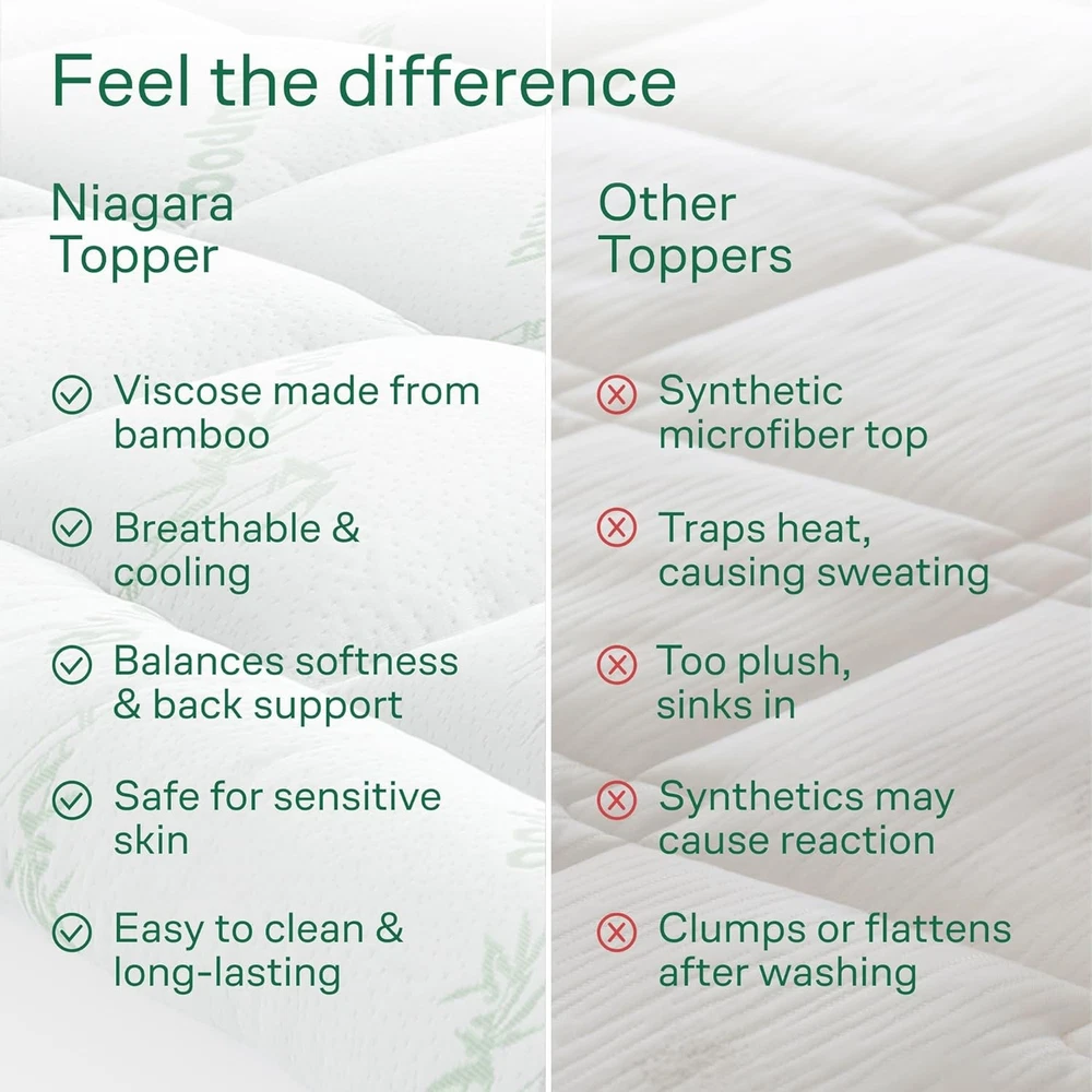 Mattress Topper Queen Viscose Viscose Made from Bamboo Pillow Top Mattress About this item: ULTRA SOFT: Niagara Queen Mattress Topper is made from viscose made from bamboo fiber and fits mattresses 8-20 inches deep. The mattress topper queen is 60x80 inches in size, gentle on sensitive skin, and ultra-soft. MACHINE-WASHABLE: The queen matress topper is safe for washing machines and has no harmful chemicals like latex or formaldehyde. The queen bed pad is easy to put on and won’t slide off. CLOUD-LIKE SLEEP: This queen mattress topper adds an extra cushion to potentially ease back pain. The back support mattress topper queen is also cool and sweat-absorbent for extra comfort EASY TO USE: The pillow top mattress topper queen has a deep pocket, is easy to put on, and has extra-length stretchy sides for thick mattresses. The queen topper is machine-washable and is fluffy after drying.
