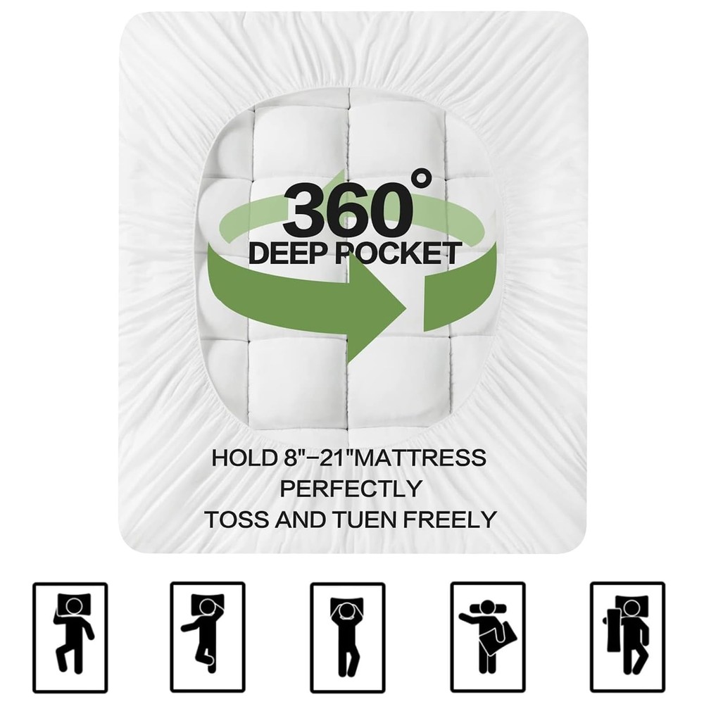 mattress topper 【SOFT & OPTIMAL FILLING】 With 1200GSM ultra-plush mircrofiber fill, Soft,Comfortable and Breathable,provides support for your shoulders and hips,It's also an economical way to extend the life of your mattress without having to replace it with an expensive new one. 【BREATHABLE】 Our mattress topper uses 40% viscose made from bamboo (more breathable) + 60% polyester (softer) fabric, the composition is designed to prevent you from feeling stuffy and sweaty, allowing for more efficient airflow to reduce overheating, therefore allowing you to enjoy a refreshing relaxation experience. 【DEEP ELASTIC POCKET】Fits mattresses from 8" - 21". Our deep pockets are designed for all types of mattresses.Ensures your mattress topper stays firmly in place 【MACHINE WASHABLE】This mattress topper is easy to take care of, throw it in the washing machine, wash it in cold water, economical and sustainable 【SERVICE 】If you have any reason not satisfied with it, please our customer support, we will do our best to your satisfaction.