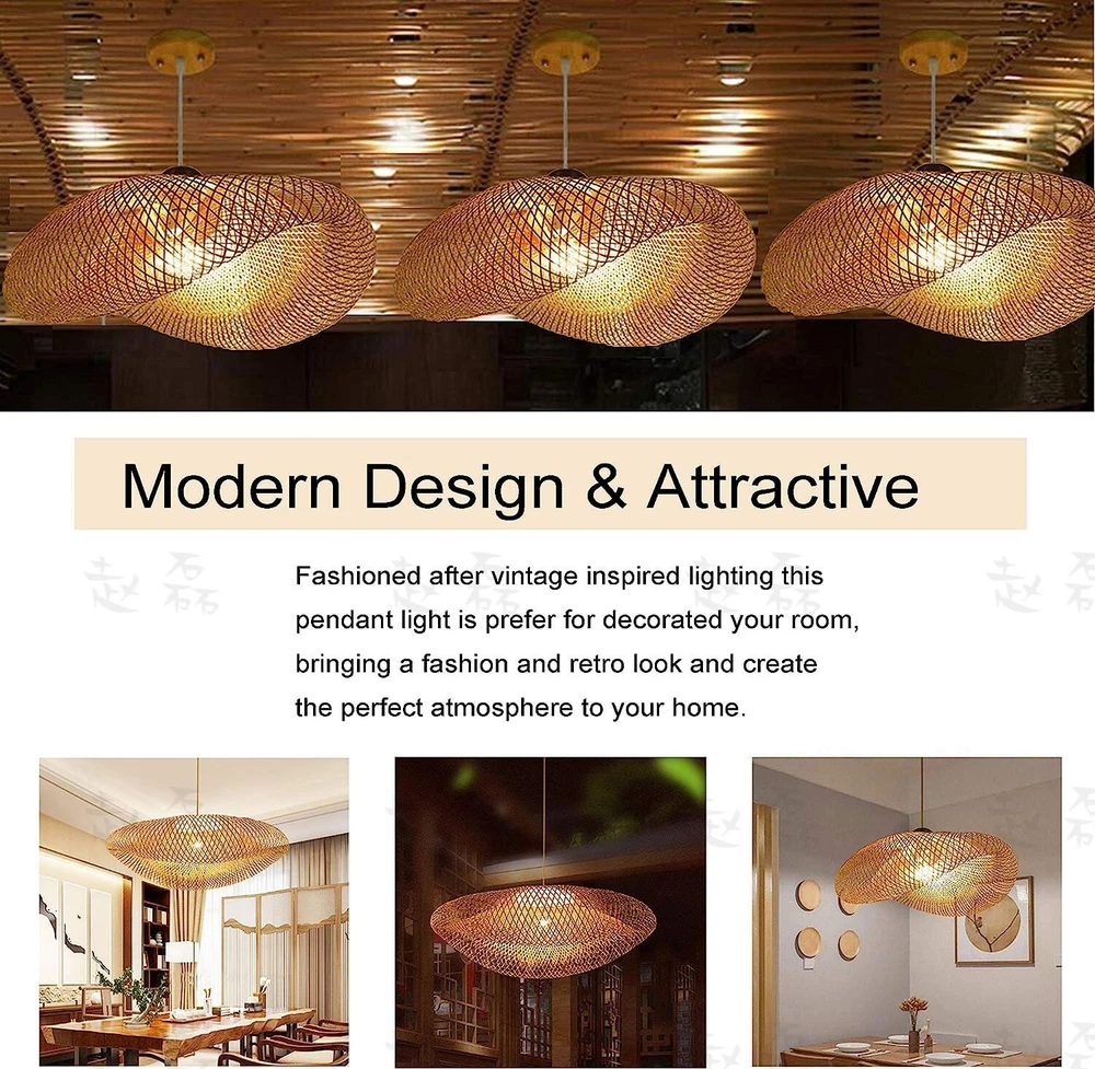 Bamboo Wicker Rattan Shade Pendant Light Fixture Art Asian Hanging Ceiling Lamp Bamboo Weave Ceiling Pendant Light Unique Hand-woven Chandelier Hanging Lamp Product Description: ★ Natural bamboo silk is purely hand-woven. After mildew-proof, moth-proof and insect-proof treatment, it is soaked in water-soluble varnish, which is fashionable and environmentally friendly. ★ Hollow woven lampshade, unique design, uniform light transmission, warm and soft light, and better atmosphere decoration. ★ E27 screw cap, high temperature resistant cap, this is easy to install and use. ★ Thickened baking paint ceiling plate, spin-polished, high-temperature environmental protection paint treatment, durable and rust-proof. ★ Suitable for different styles, recommended occasions: living room, bedroom, dining room, leisure venue, etc. Features: Material: Bamboo Light source: E27 bulb (NOT included) Lighting area: 10-15 square meters Voltage: 85-260v Whether to include bulbs:NO Hanging wire length: 100cm Application: dining room / bra / bedroom / living room / club The package includes: 1x bamboo chandeliers (NOT including bulbs) Payment Delivery details Terms of sales About us Contact us Payment We accept ebay payment 。 Fees such as import duties, taxes are not included in the item price or shipping costs. These charges are the buyer's responsibility. Delivery details Shipping: 2-9 working days to: USA Terms of sales We maintain high standards of excellence and strive for hundred percent customer satisfaction. Feedback is very important to us. We hope that you contact us immediately before you give neutral or negative feedback, so that we can address your concerns. It is impossible to address issues if we do not know about them! About us Your satis faction is our ultimate goal. We work hard to earn your trust and future business. Our certified technicians have tested each item before shipping. The unit comes with 1 year limited warranty on all manufacturing defects. a) If you receive a defective item, you may return it or ask for a discount. Please contact us within 14 days after you receive the package. b) What you returned must be intact and in its original packaging as re? u. Customer is responsible for shipping costs of the returned item. c) We will cover the cost of shipping back t with the shipping rate indicated in the registration page. We will send you a new unit or refund the full payment you paid. Thank you. Contact us Business Hour Business Hour: Monday To Friday: 8:30 AM to 5:00 PM (Beijing China time) Due to time zones, our reply to your questions may not be immediately. But within above working time, we will reply your email within 24 hours. If it's non-workdays, please kindly be patient and wait till Monday. Please contact us with ebay message. Please feel free to contact us if you have any questions. Monday To Friday: 8:30 AM to 5:00 PM (Beijing China time) Due to time zones, our reply to your questions may not be immediately. But within above working time, we will reply your email within 24 hours. If it's non-workdays, please kindly be patient and wait till Monday. Please contact us with ebay message. Please feel free to contact us if you have any questions. * Feature * Creative Design,Durable Material,Beautiful Appearance Features Long Service Life,Exquisite Appearance,High-quality Shipping Notice Can not ship to Puerto Rico,Alaska/Hawaii Type Pendant Brand Unbranded Voltage 85-260v Material Bamboo, Wood Category Multi Light Pendant Uses indoor lighting Item Height 100mm Item Width 60cm/23.62" Bulb base E27 Whether to include bulbs do not include bulbs Style Modern Power Source Hardwired Room Bar, Hallway, Kitchen, Cafe, Restaurant Color Gold Diameter 60cm (23.622inch) Manufacturer Warranty 2 Years On Jan 5, 2025 at 22:54:37 PST, seller added the following information:
