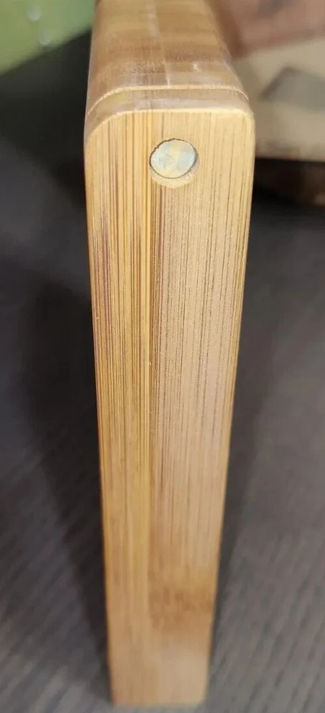 Bamboo Cheese Board with Cheese Knives (3) Cheese Fork (1) Magnetic Storage inside. 7.50" x 7.50" 1.875" high. Used with the original box. Usage wear and scuffing on Wood board and handles. See photos.