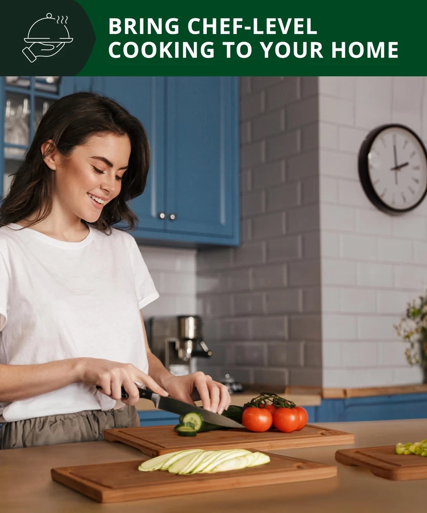 Wooden Cutting Boards for Kitchen Meal Prep & Serving - Bamboo Wood Serving Board Set with Deep Juice Groove Side Handles - Charcuterie & Chopping Butcher Block for Meat (3 Pcs) π ππππ πππ πππππ: Our bamboo cutting board set includes 9x6β, 12x8β, & 15x10β optionsβyour go-to kitchen essential for chopping, prepping, or styling a charcuterie board. πππππ-ππ ππππ πππππππ: Our wooden cutting board doubles as a chopping block, serving tray, or cheese platterβbuilt-in side handles make kitchen-to-table transfers effortless and mess-free. ππππ π-πππ π, ππππππ ππππ πππ: These cutting boards for kitchen are gentle on blades to prevent dulling, with a smooth bamboo finish and protective coating that resists scratches, stains, and bacteria. ππ ππππ πππππππ πππ ππππππ ππ: Our professional grade cutting boards feature deep juice grooves to catch liquid from meats and fruitsβkeeping your counters clean and chopping boards spill-free for easy transfers. ππππ ππ πππππ & ππππππππ: Naturally resistant to odors and stains, bamboo makes post-cooking cleanup quick and simpleβjust rinse, wipe, and you're good to go. ππππ πππ πππ π ππππ: Whether itβs a housewarming, new home celebration, or Motherβs Day, this bamboo cutting board set is a practical yet stylish gift theyβll use and appreciate every day. π°πππππ-ππππ ππππππππ: Our brand, is committed to providing our customers the best possible support and satisfaction. Thatβs why we offer a comprehensive customer support program with a 1-year warranty, a money-back guarantee, and 24/7 customer support. We understand the importance of standing behind our products and ensuring our customers are delighted Made of 100% sustainable bamboo Our wooden cutting boards are crafted from minimally refined natural Moso bamboo for a durable and sustainable everyday home piece. Water & odor-resistant surface The organic composition of our cutting board sets makes them naturally and most convenient bamboo cutting boards for kitchen use when chopping meats over fear of cross-contamination. Built-in drip grooves Strategically designed cutting board with juice groove edges for drip-catching technology, so you can dice your juicy tomatoes, season your juicy meats, and slice runny watermelon without the hassle of a puddled countertop and sticky floors. Beveled side handles Our wooden chopping board set was made for mobile use so you can swiftly pick up and carry to your desired spot. Weβve found a way to avoid the suction effect you often face with butcher block boards or other heavy duty cutting boards, so you can move and position to your convenience. Ultra resilient composition The durable bamboo structure of our kitchen cutting board set makes for a scar resistant surface and effortless maintenance. Smooth enough so your knives can glide back and forth easily, without defacing your cutting surface and keeping the aesthetic of your charcuterie boards. Double-sided reversible design Use your trays to their full potential when you take advantage of their versatile use as a chopping board, serving platter, charcuterie board cheese board tray, and more! SHIPPING Domestic Buyers - We have confidence in our products, but if you are not fully satisfied please contact us within 30 days of purchase and you will get full refund. - We ship within 3 business days of payment, usually sooner - We offer FREE shipping on all orders! - We only ship to the lower 48 states, no APO/FPO addresses or PO Boxes allowed International buyers β please note: Import duties, taxes, and charges aren't included in the item price or postage cost. These charges are the buyer's responsibility. - Please check with your country's customs office to determine what these additional costs will be prior to bidding or buying. * Order Cancellation Policy ** You can return a product for up to 30 days from the date you purchased it. 1. The seller reserves the right to cancel the special case only due to eBay cancellation fee. 2. The decision of seller is the final. 3. The seller will respond to the cancellation request within 2 business days. Please wait for the result of cancellation. 4. In case the cancellation is not completed by some reasons, the buyer can follow the options below to get the refund. 4.1 The buyer can reject the item when it arrives. 4.2 The buyer can send the item back to the seller within 30 days If the buyer receives item (USA Shipment ONLY). The seller will provide the FREE return label to the buyer when the buyer opens " Return Item" case on eBay by using the reason as "Change my mind" ONLY. 5. When buyer has placed the order. The order will be processed and completed by automatic warehouse system within 5 minutes. In case that buyer sends the cancellation request after 5 minutes of placing the order, the request will be rejected. **Sending direct message to cancel the order is not allowed for every case.* Return Policy For the return case - If buyer would like to return the items for refund or replacement, please CONTACT SELLER to receive the free return label from seller. The refund or replacement will be processed with the tracking number of return label which is provided by seller only. The other ways of return which are not approved by seller will not be processed for the refund or replacement.