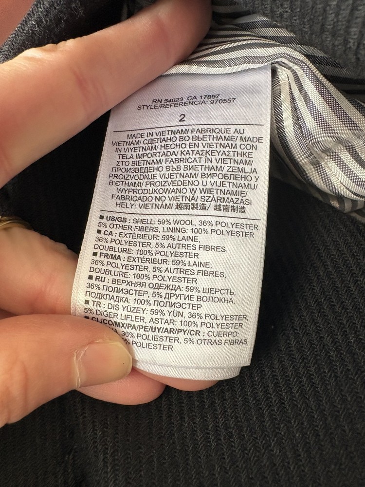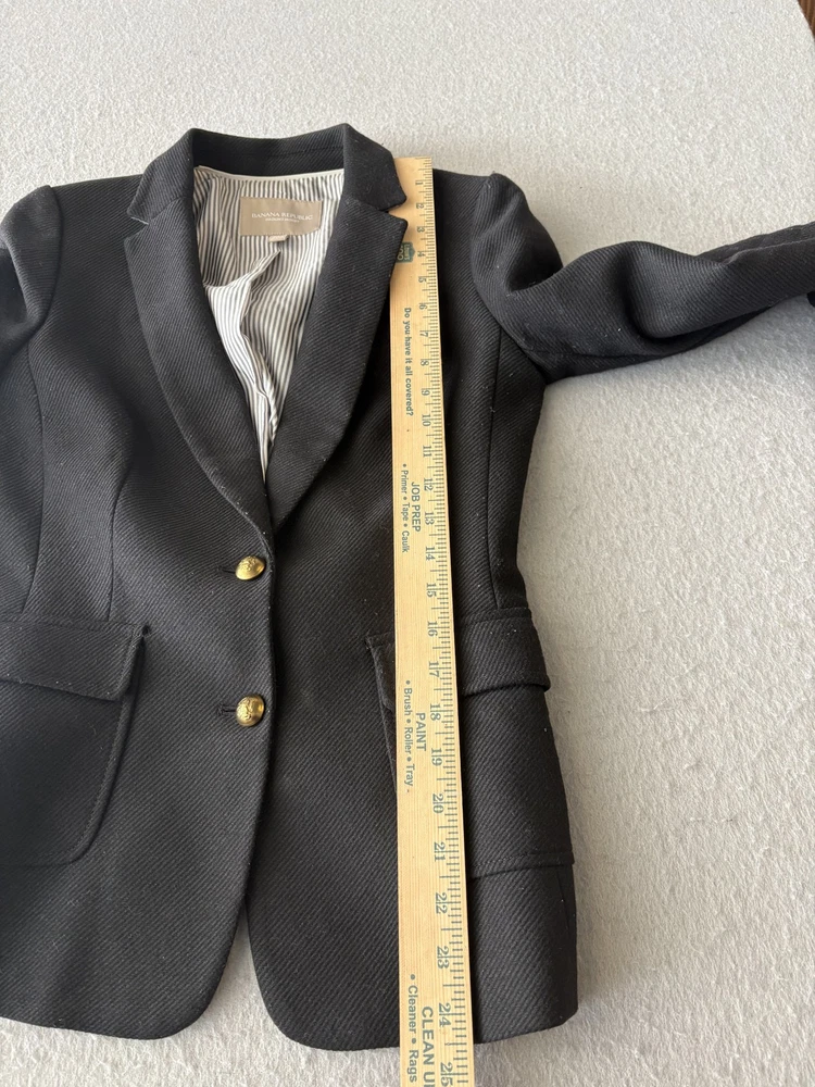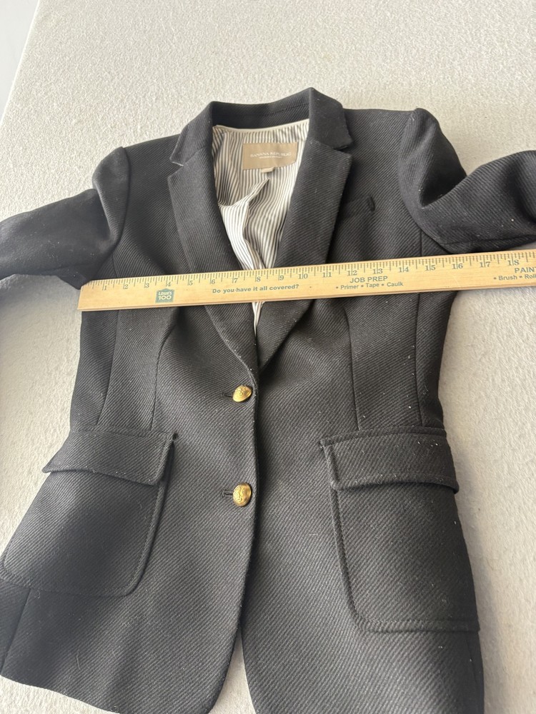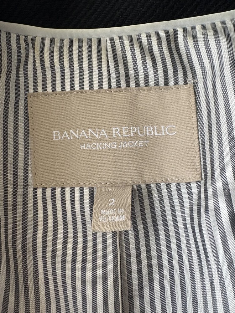 Brand: Banana Republic Item: Womens tailored blazer with notched lapel and two-button front closure. Color: Solid black exterior with striped gray and white interior lining. Gender/Size: Womens size 2 regular. Material: Shell 59% wool, 36% polyester, 5% other fibers; lining 100% polyester. Design details: Slim fit silhouette, structured shoulders, gold-tone crest buttons at front, flap front pockets with ticket-pocket style detail, back seams for shaping, and fully lined interior. Style/Model: Banana Republic Hacking Jacket blazer style 970557. Tag details: Interior label reads Banana Republic Hacking Jacket, size 2, Made in Vietnam; care tag lists RN 54023 and CA 17897 with fiber content information. Occasion/Use: Ideal for business, office, and workwear outfits, or pairing with trousers or jeans for polished everyday looks. Notes: Classic wool-blend Hacking Jacket design made to coordinate with pant suits and tailored separates.