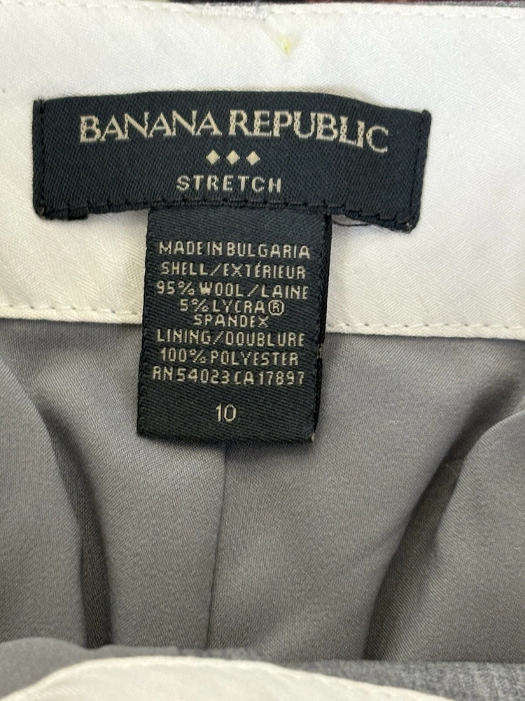 These Banana Republic dress pants are made of wool in a modern fit style with a straight leg. They feature a checkered pattern in black, a flat front design, and a waist size of 30 inches. The pants have a zip and button closure, slash pockets, are lined, and have a 31-inch inseam. Suitable for casual, formal, or business occasions, they provide a preppy and city-themed look.