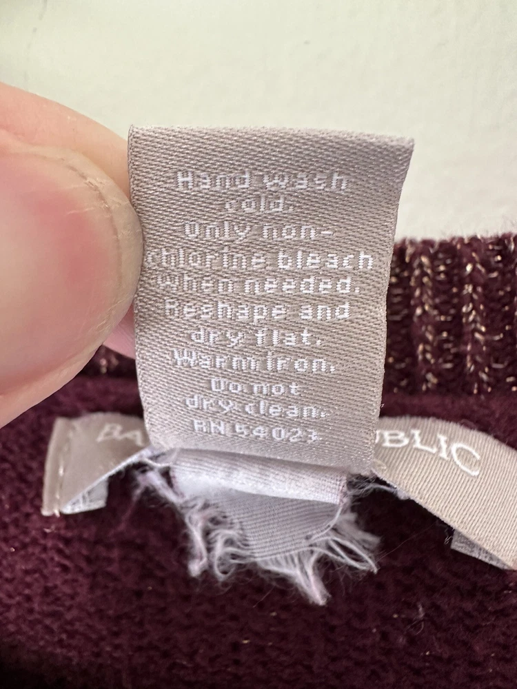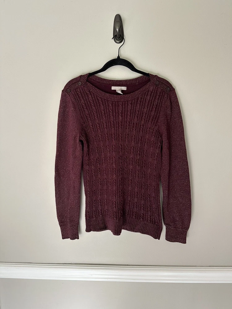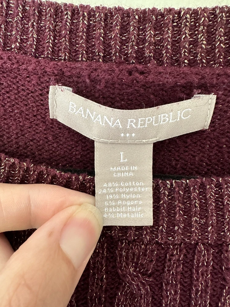 This beautiful Banana Republic sweater is perfect for any occasion. With a crew neckline and long balloon sleeves, it features a stunning multicolor metallic cable-knit design that adds a touch of sparkle and glimmer. Made from a blend of polyester, angora rabbit hair, cotton, and metallic fibers, this sweater is stretchy and comfortable to wear in any season. Whether you're dressing up for a party, dressing down for work, or simply looking for a cozy everyday sweater, this piece is a must-have addition to your wardrobe. It's available in size L and is hand wash only. Shop now and add some sparkle to your closet!