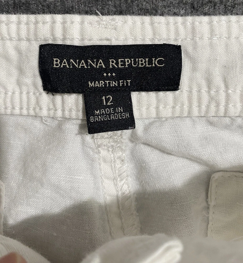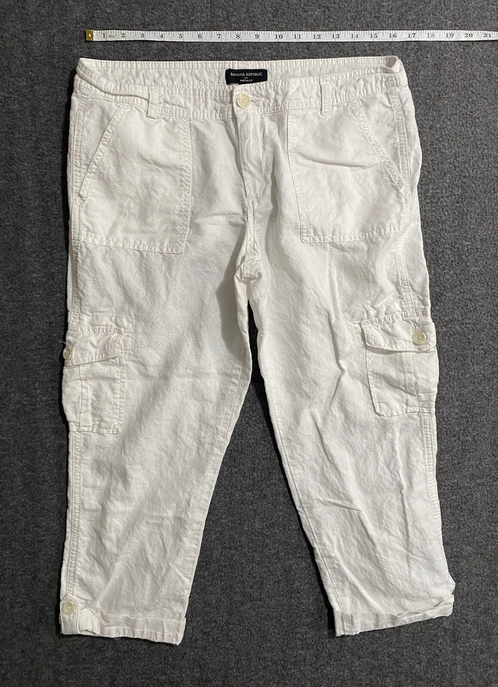 Closure: Zip Garment Care: Machine Washable Vintage: No Features: Breathable, Comfort, Crop, Roll Tab Cuff Department: Women Accents: Button, Roll Tab Cuff Pattern: Solid Waist Size: 34 in Color: White Handmade: No Size Type: Regular Model: Banana Republic Martin-Fit Personalization Instructions: N/A Size: 12 Season: Summer, Spring, Fall Style: Cropped Occasion: Casual, Travel Front Type: Flat Front Country/Region of Manufacture: Bangladesh Fit: Regular Fabric Type: Woven Inseam: 21 in Type: Pants Theme: Preppy, City, Beach Personalize: No Rise: Mid (8.5-10.5 in) Material: Linen Brand: Banana Republic Leg Style: Tapered