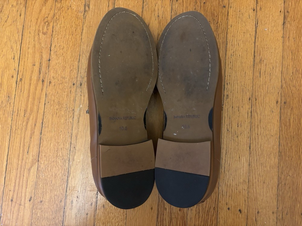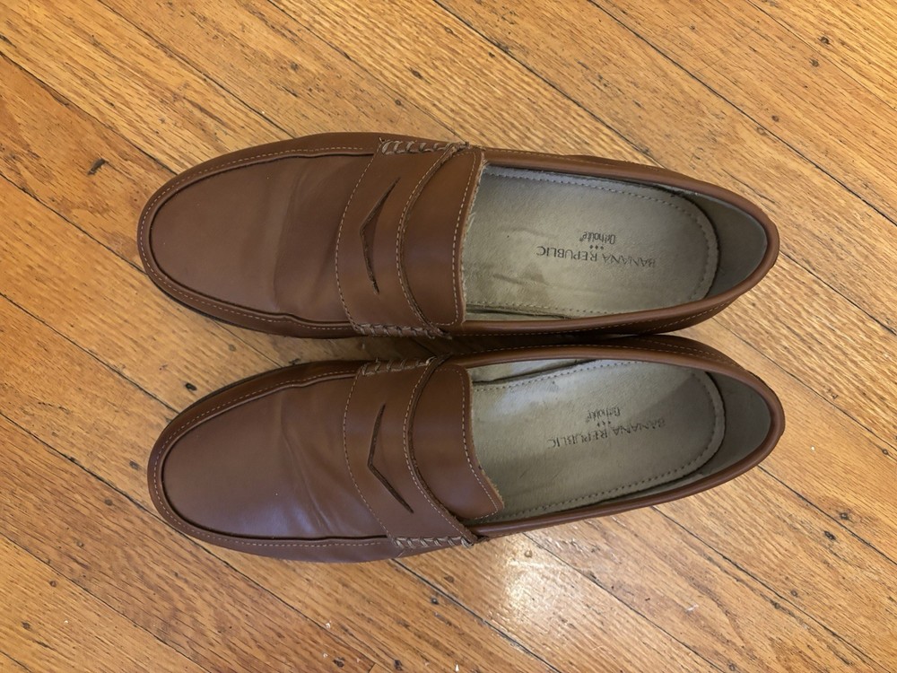 The Banana Republic Cognac Light Brown Penny Loafers in Blake Stitch are a stylish and sophisticated choice for men looking to elevate their outfit. Made from high-quality leather with a cushioned insole, these slip-on loafers offer comfort and durability. The classic solid brown color and sleek design make them suitable for various dressy occasions, while the leather lining and outsole add a touch of luxury to the overall look. Perfect for professionals or those seeking a polished yet casual shoe option for a sharp and put-together appearance.