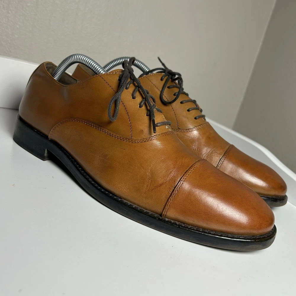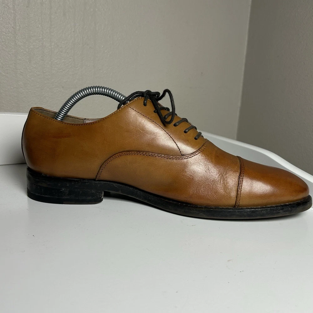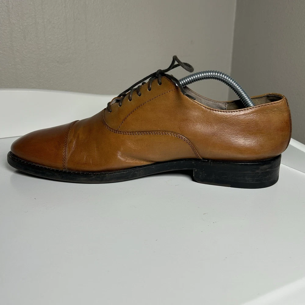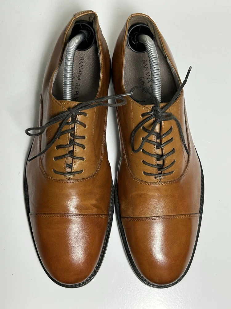 The Banana Republic Men's Cognac Leather Cap Toe Lace-Up Oxford Dress Shoes in size 8M are a classic and stylish choice for any formal occasion. Made from high-quality leather with a rubber outsole, these shoes feature a solid pattern, round toe shape, and intricate cap toe detailing. The lace-up closure adds a touch of sophistication to the design, making them perfect for the spring season. With the reputable Banana Republic brand and timeless Oxford style, these dress shoes are a versatile addition to any man's wardrobe.
