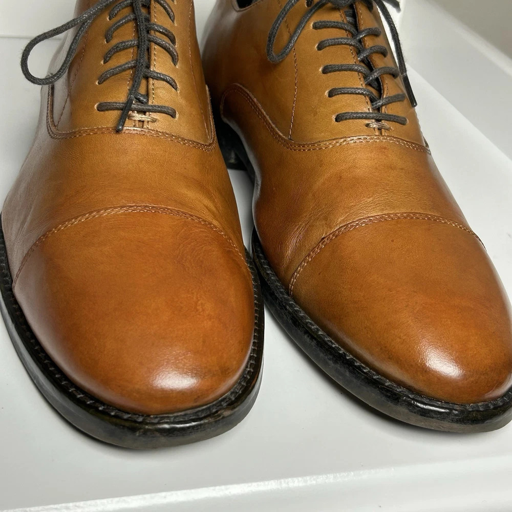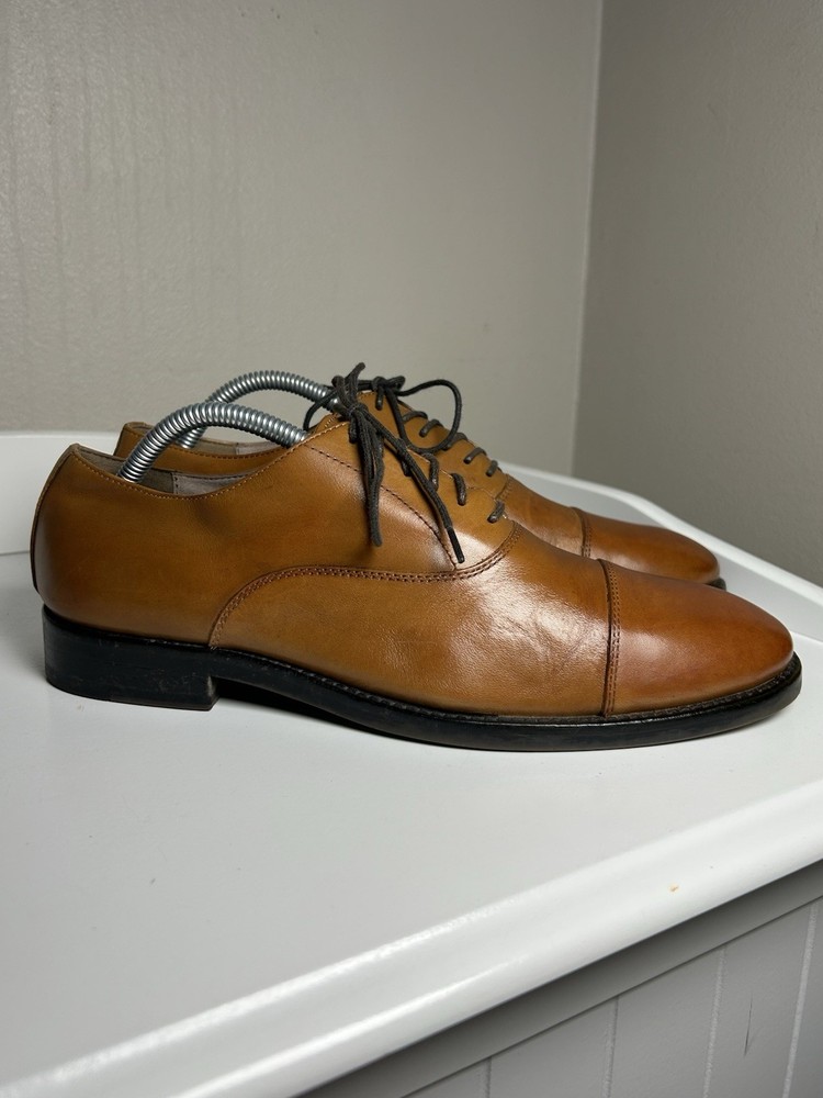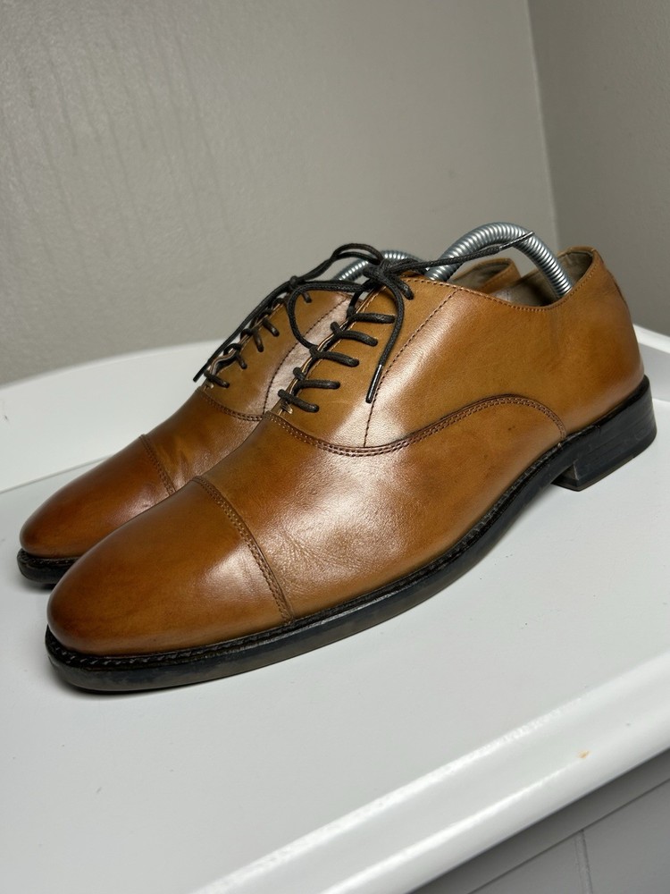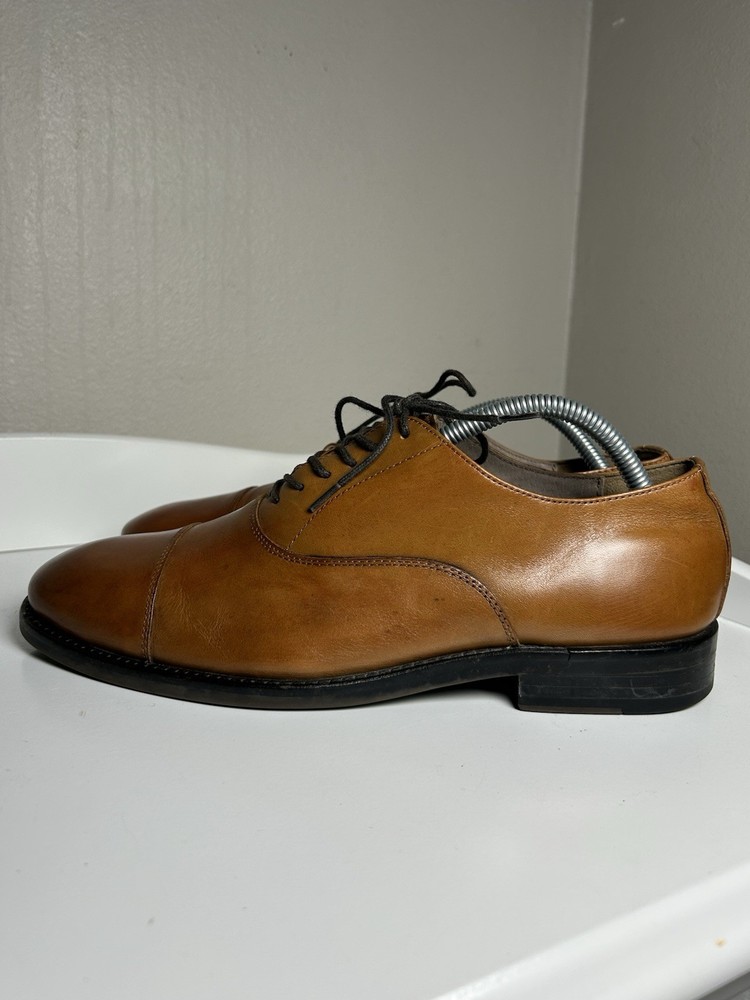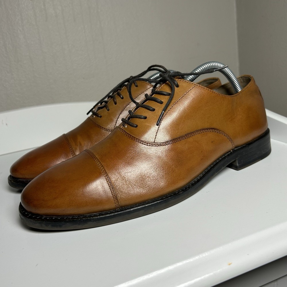 The Banana Republic Men's Cognac Leather Cap Toe Lace-Up Oxford Dress Shoes in size 8M are a classic and stylish choice for any formal occasion. Made from high-quality leather with a rubber outsole, these shoes feature a solid pattern, round toe shape, and intricate cap toe detailing. The lace-up closure adds a touch of sophistication to the design, making them perfect for the spring season. With the reputable Banana Republic brand and timeless Oxford style, these dress shoes are a versatile addition to any man's wardrobe.
