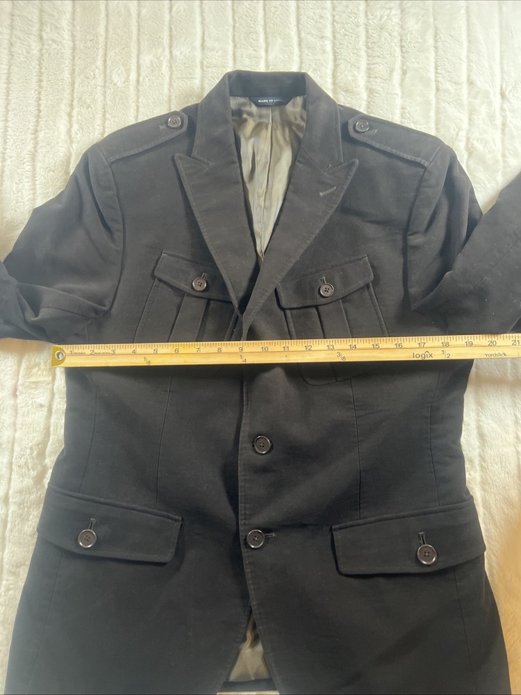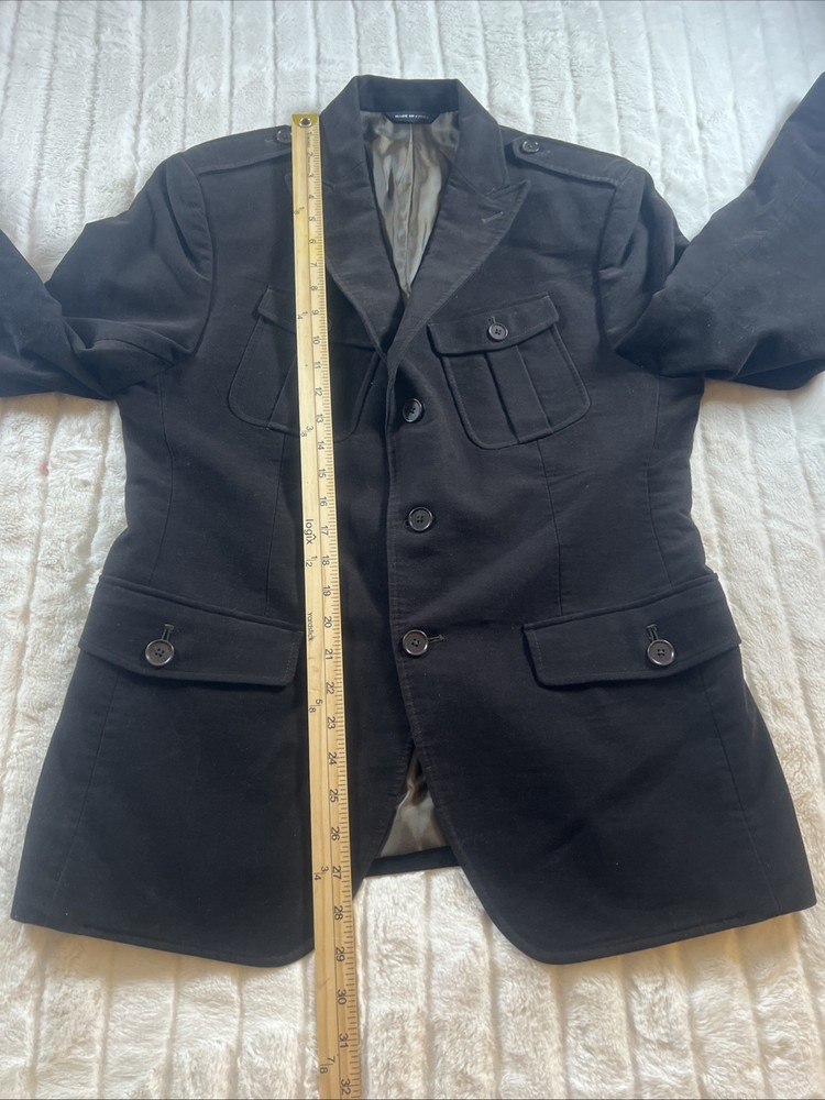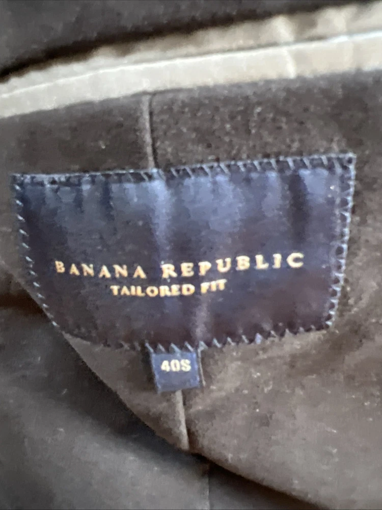 The Banana Republic Moleskin Blazer Jacket in men's size 40S features a tailored fit in a solid brown cotton material, making it suitable for various occasions such as parties, casual wear, work, and business meetings. This classic military-style blazer has a polyester lining and button closure, with a unique moleskin fabric type that adds a touch of sophistication. With its retro and minimalist design, this blazer is perfect for the fall and winter seasons, offering both style and functionality for the modern man.