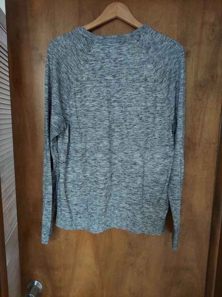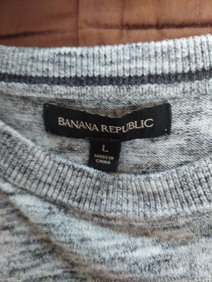 This Banana Republic sweater is perfect for any occasion. With a solid pattern and tight-knit fabric, it features a crew neckline, long sleeves, and a relaxed fit. The soft gray color and marbled design make it a stylish addition to your wardrobe. Made of lightweight cotton, this sweater is machine washable and suitable for all seasons. It is collarless and has a crew neck, making it perfect for both casual and formal occasions. Whether you're traveling, going to a party, or just working, this sweater is a great choice. Available in size L, it is a must-have for any fashion-conscious woman.