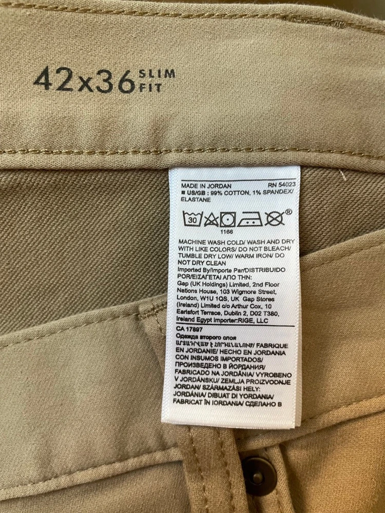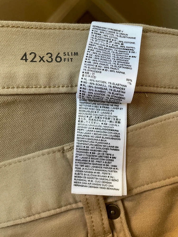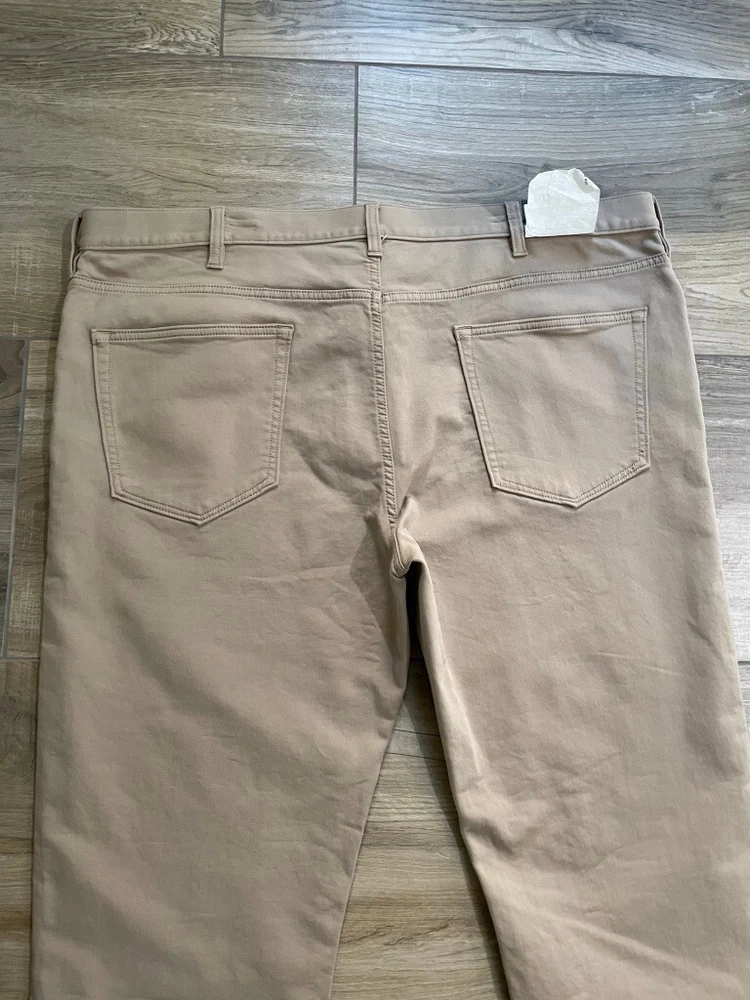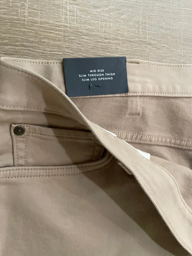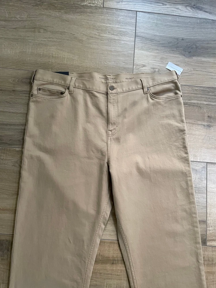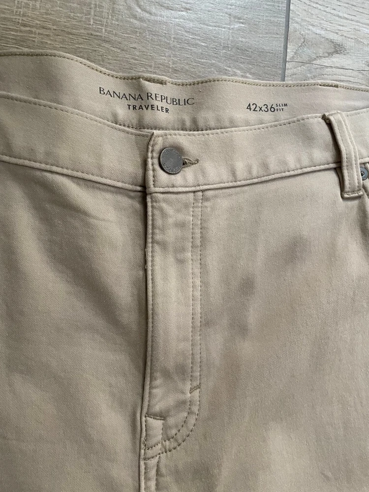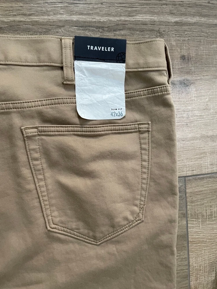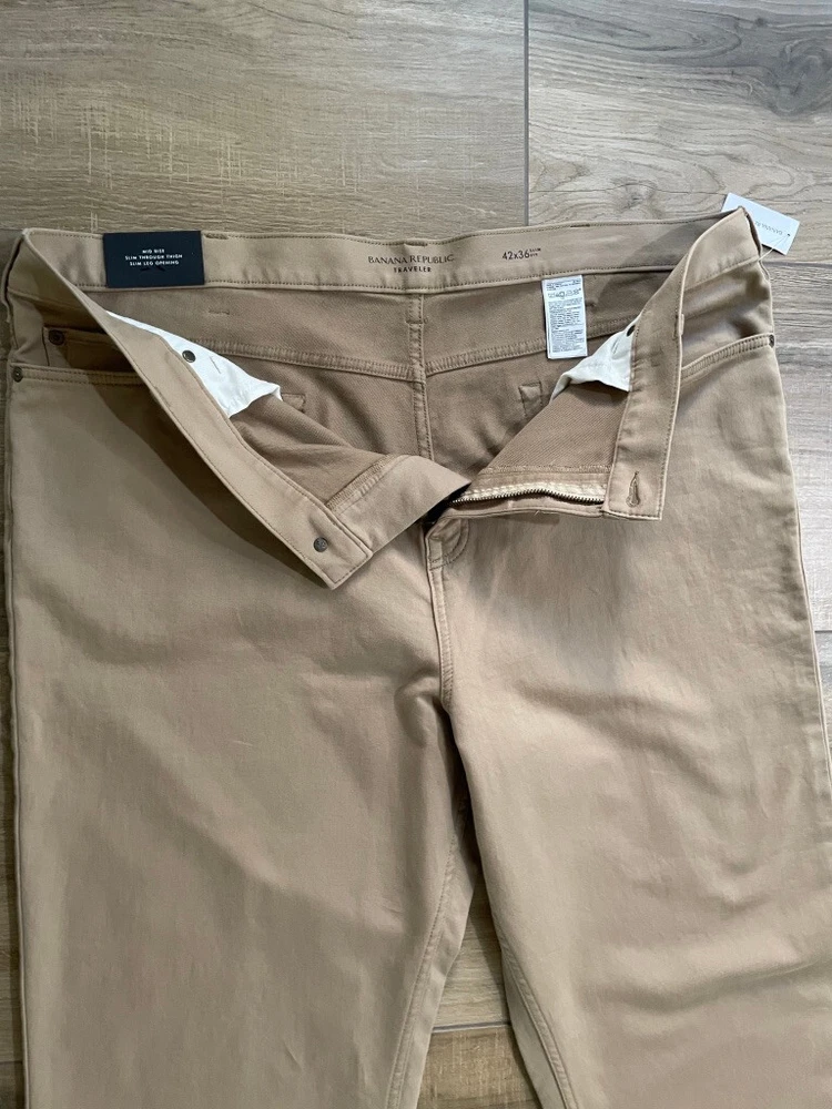 Banana Republic Traveller Pants Style: Slim Fit Stretch 5 pocket construction - HIGH WAIST Color: Beige Khaki Features: Stretch, zip fly Fabric: 99% Cotton, 1% spandex Approximate flat measurements**: Waist 22", Rise 14 1/2", Inseam 36" Condition: New with tags Tag Size: 42x36** see measurements as they do not exactly match size tag