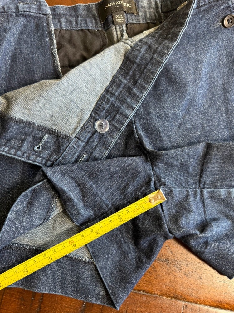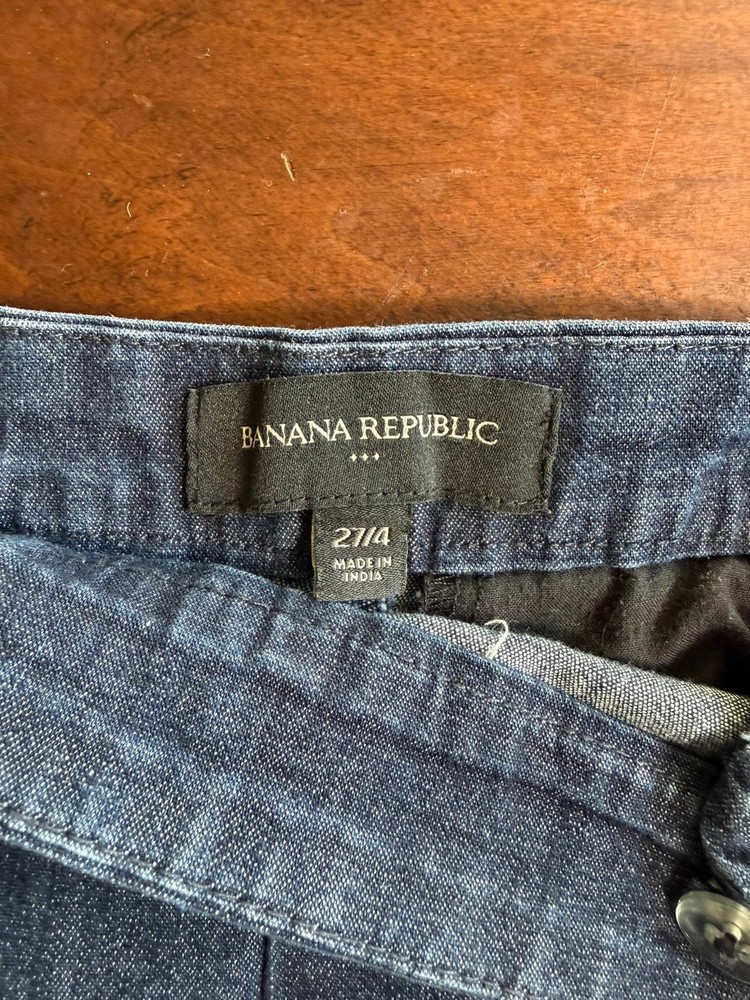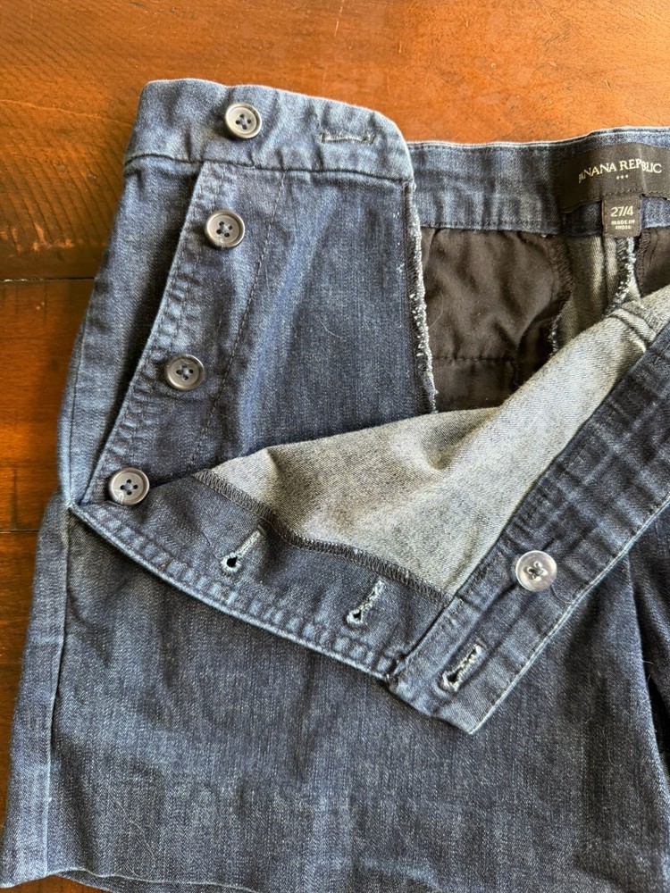 The Banana Republic Women's Blue Denim Side Button Jean Short in size 27/4 is a stylish and versatile addition to any woman's wardrobe. Made from comfortable cotton denim, these shorts feature a flat front design with a zip closure and side button accents for a trendy twist. Perfect for casual occasions in the summer or spring, these regular fit shorts have a 5-pocket design and a waist size of 27 inches. Machine washable for easy care, these shorts by Banana Republic are a must-have for any fashion-forward woman.