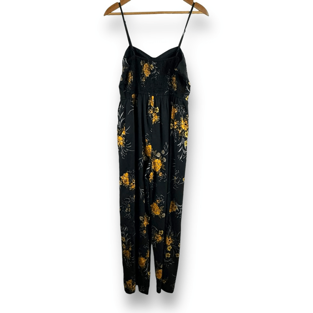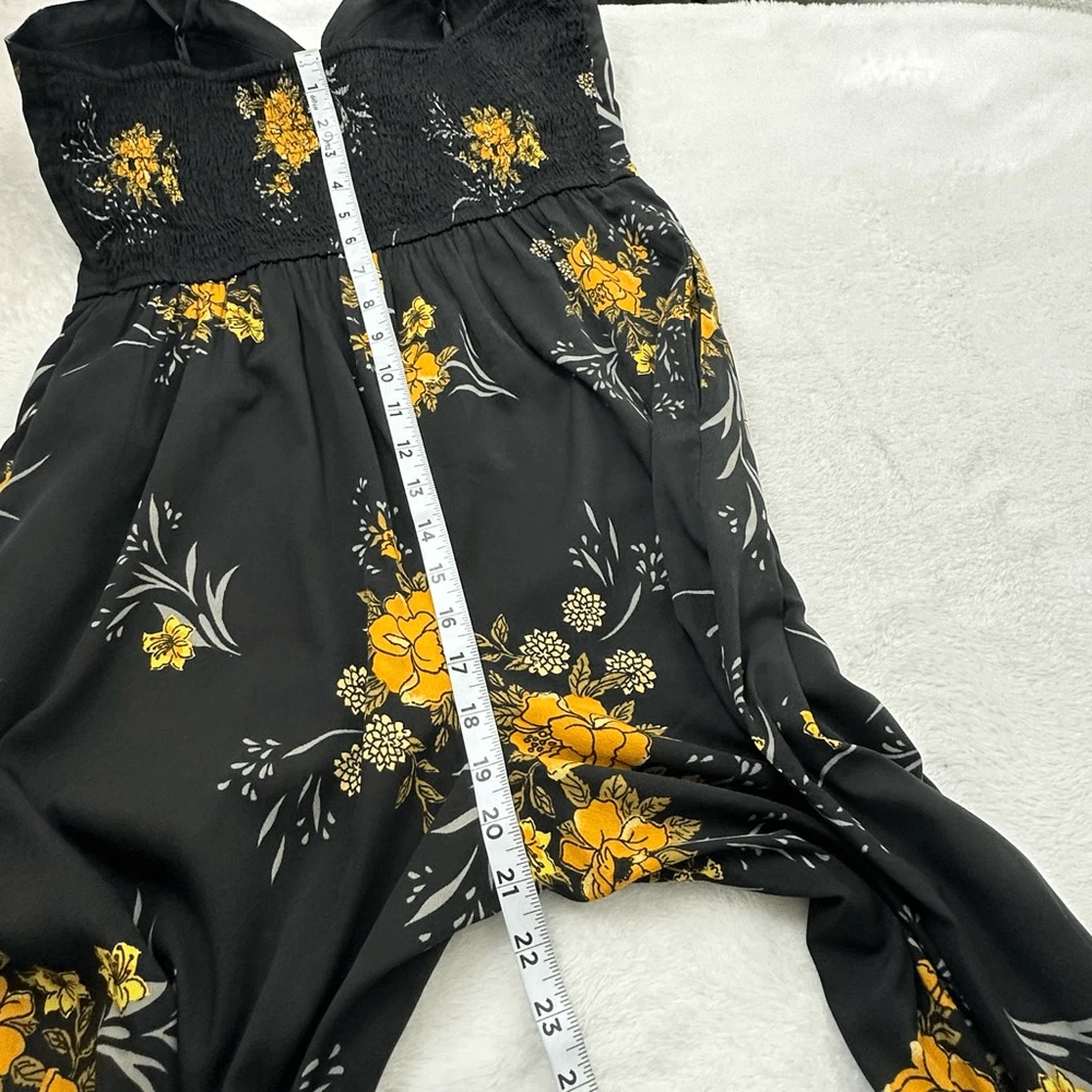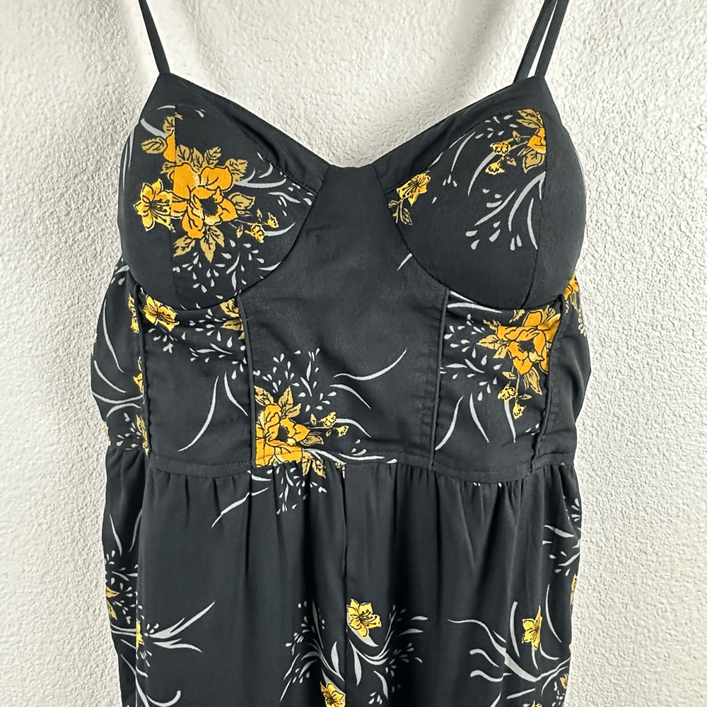 Band Of Gypsies Women's L Bustier Corset Top Jumpsuit Black With Yellow Floral Size L- See photos for approximate measurements Smocking adds some stretch- adjustable straps Preowned/gently used Ships fast Ships from a smoke free pet friendly home