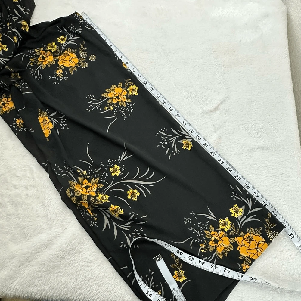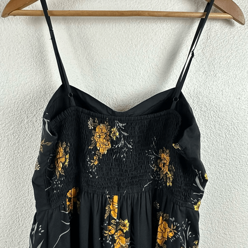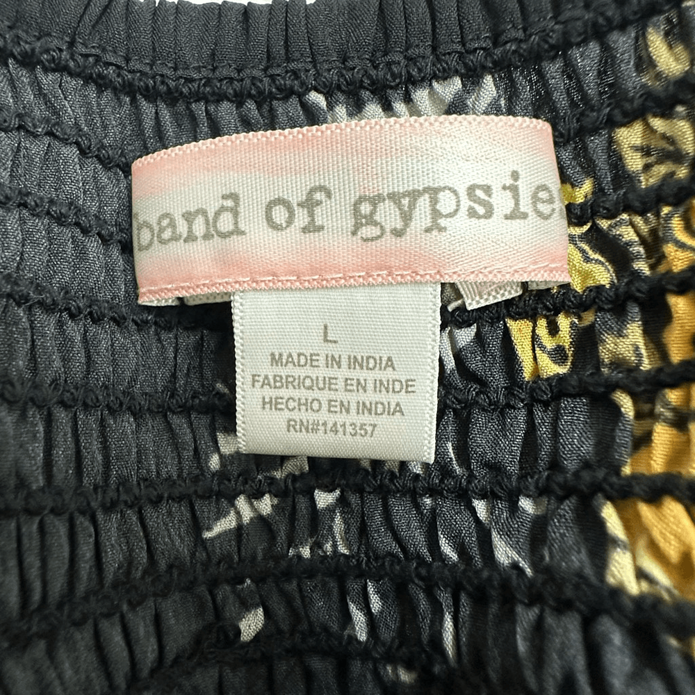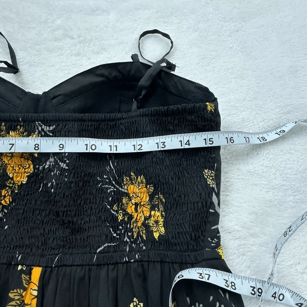 Band Of Gypsies Women's L Bustier Corset Top Jumpsuit Black With Yellow Floral Size L- See photos for approximate measurements Smocking adds some stretch- adjustable straps Preowned/gently used Ships fast Ships from a smoke free pet friendly home