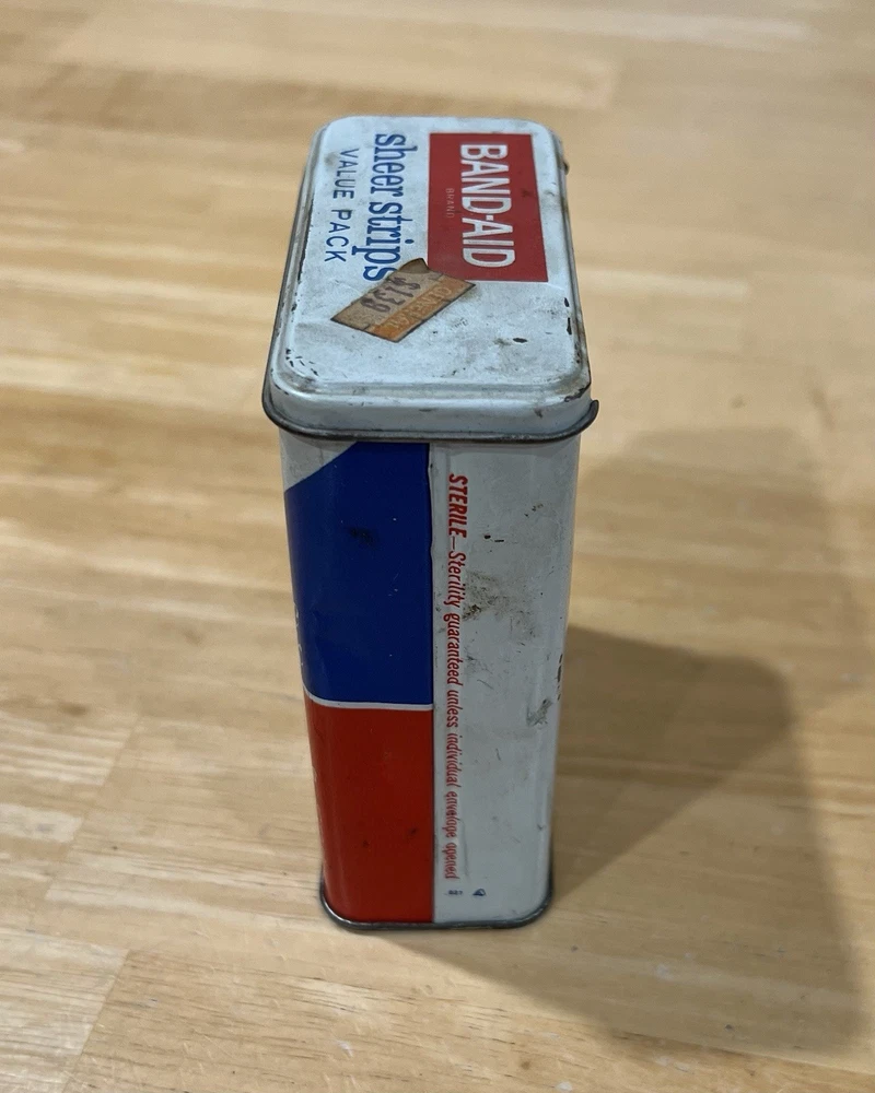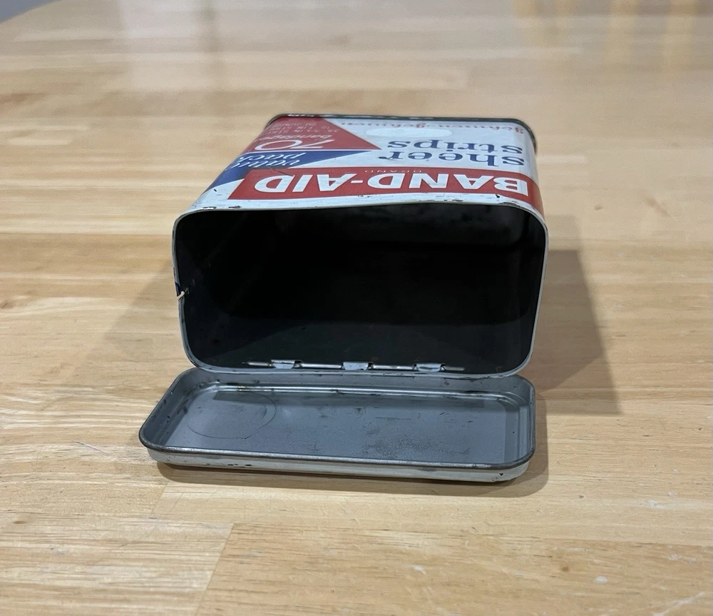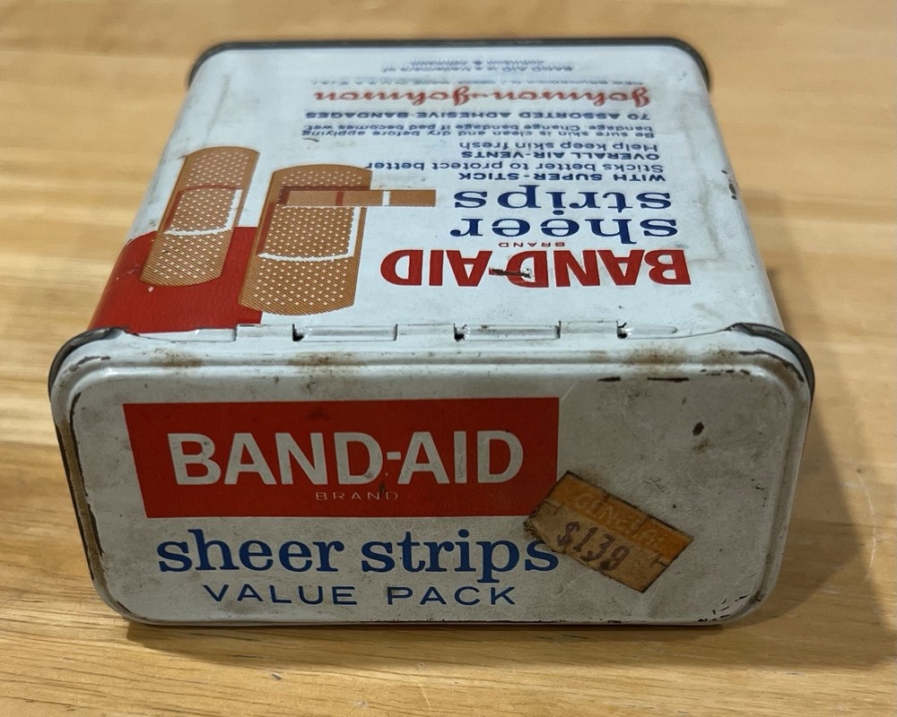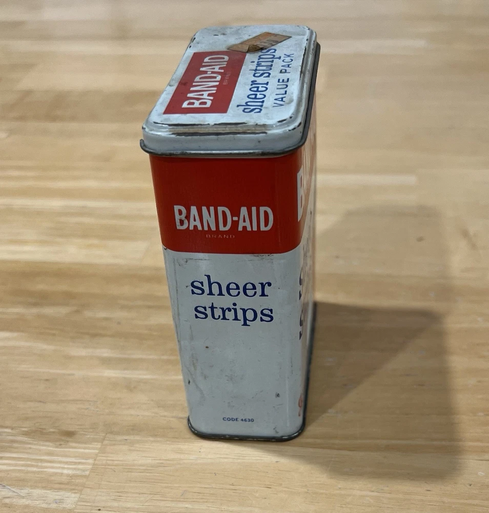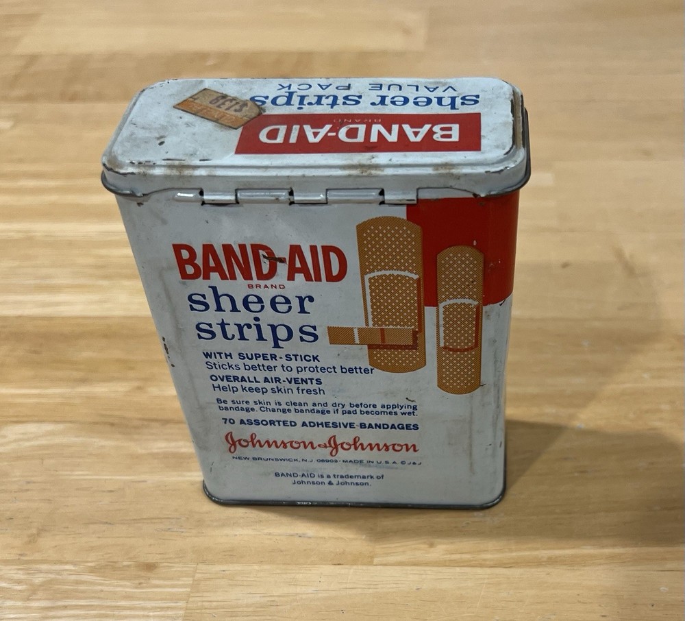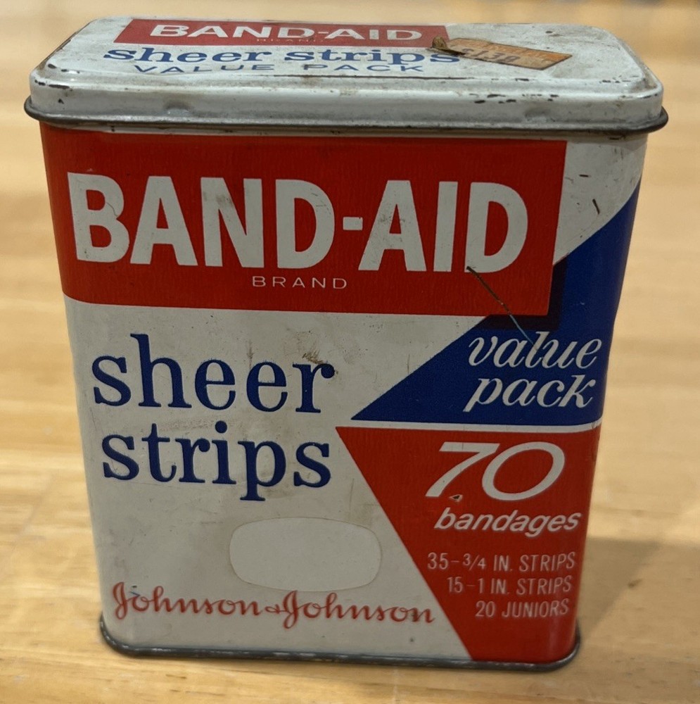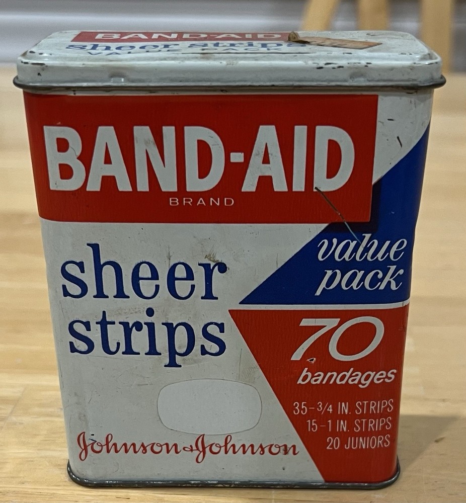 The Band-Aid Vintage Tin by Johnson & Johnson showcases a nostalgic design with assorted adhesive bandages. This original collectible item features vibrant multi-color packaging, perfect for those interested in medicine and first aid memorabilia. The iconic Band-Aid brand is synonymous with quality adhesive products, making this tin a must-have for collectors of vintage advertising and health-related items.
