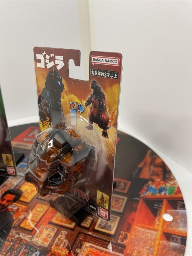 Bandai Godzilla Transforming Egg figures from the 2024 series. These figures, when in their egg form, are designed to transform into the characters Burning Godzilla and Mothra. Each figure is packaged individually, displaying both the egg form and the transformed character on the packaging. The packaging also includes the Bandai Namco logo, the Godzilla logo, and the age recommendation of 3 years and up. Burning Godzilla: The egg is primarily black and orange, representing Burning Godzilla's fiery appearance. The packaging shows the egg transforming into Burning Godzilla, with his characteristic red and orange highlights. Mothra: The egg is white with brown and yellow accents, representing Mothra's colors. The packaging illustrates the egg transforming into both Mothra's adult and larval forms. These figures are part of the "Egg Monsters Godzilla" line, where the gimmick is the ability to transform between an egg shape and a monster form. When transformed, the figures stand approximately 4.5 inches tall. This is a Bandai Godzilla Transforming Egg figure set that includes Fire Godzilla and Mothra. The figures are made in Japan and are recommended for children aged 6 and above. The set features a unique design and is part of the Godzilla theme. The figures can be transformed into different shapes and are perfect for collectors and fans of the franchise.