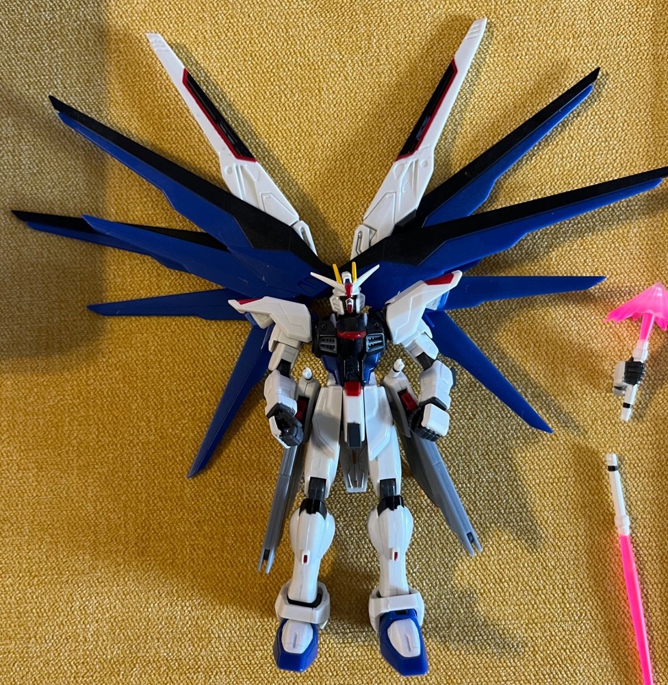 This Freedom Gundam model is awesome! Even though it's pre-assembled, the details are crisp and the articulation is solid. The box shows some wear, but the figure itself looks great—only missing the stand's clear piece. Love the bonus Gundam included, even without feet. Perfect for collectors who want a display-ready piece without building it themselves. Photos are accurate, so you know exactly what you're getting. Highly recommend!