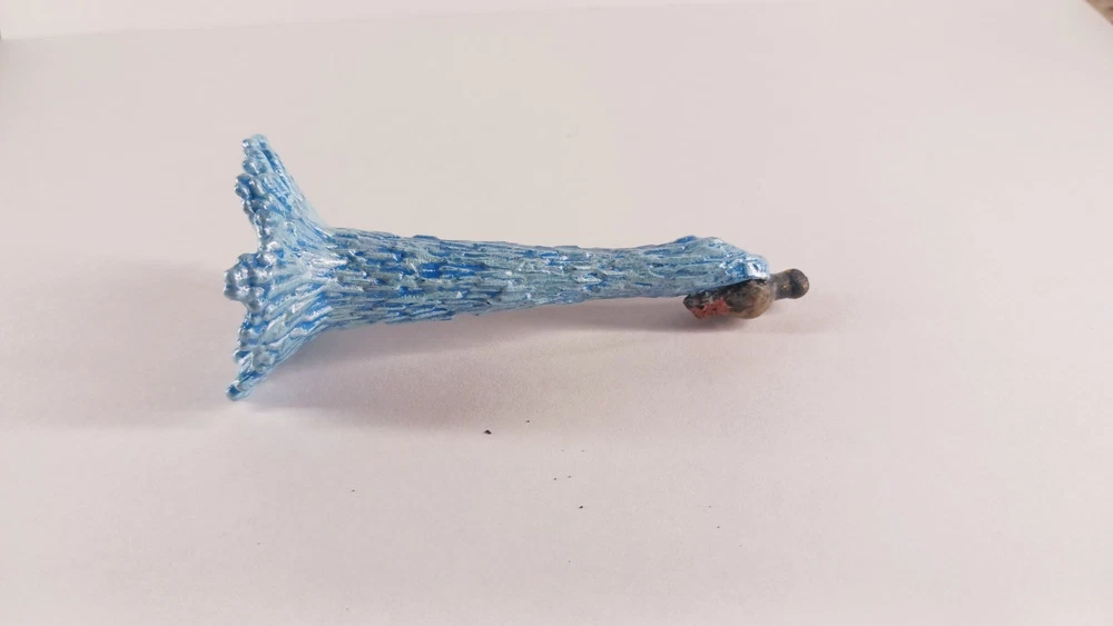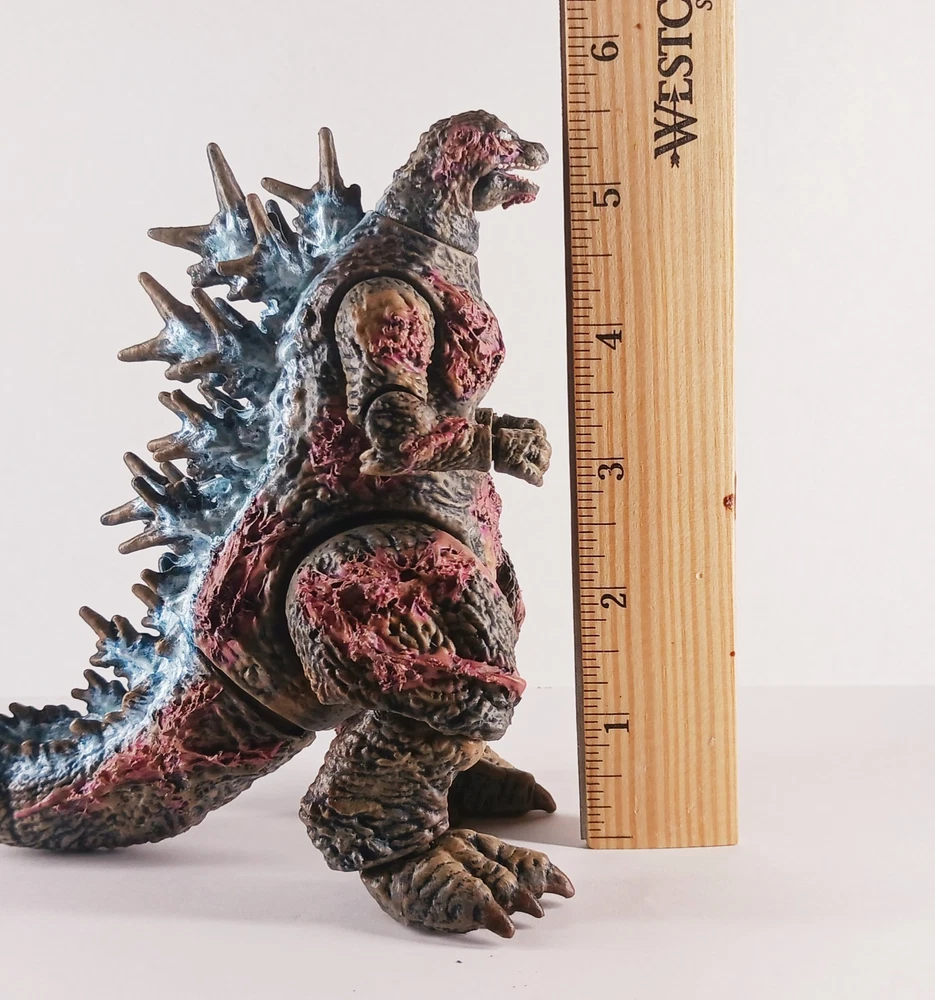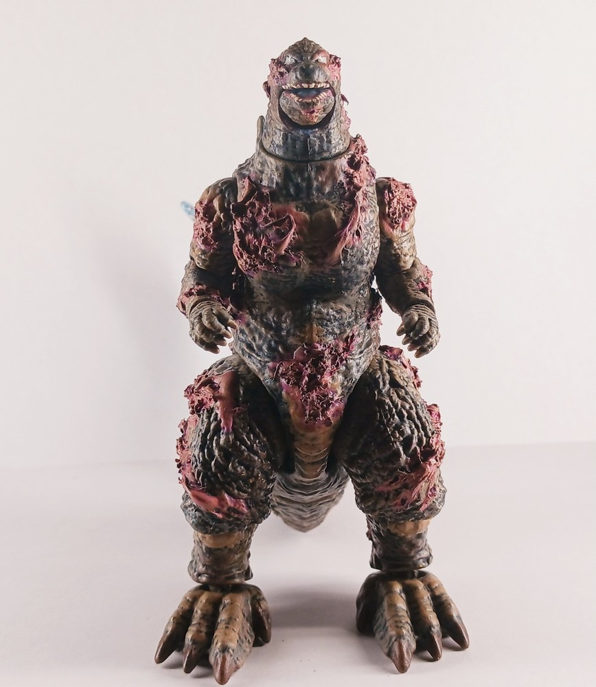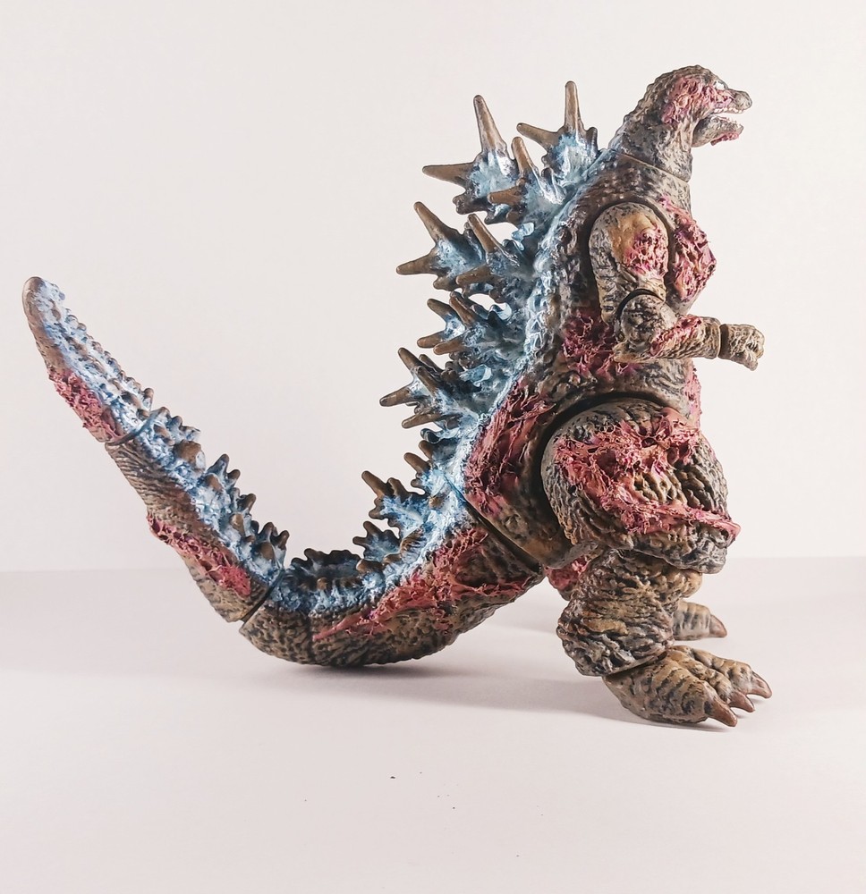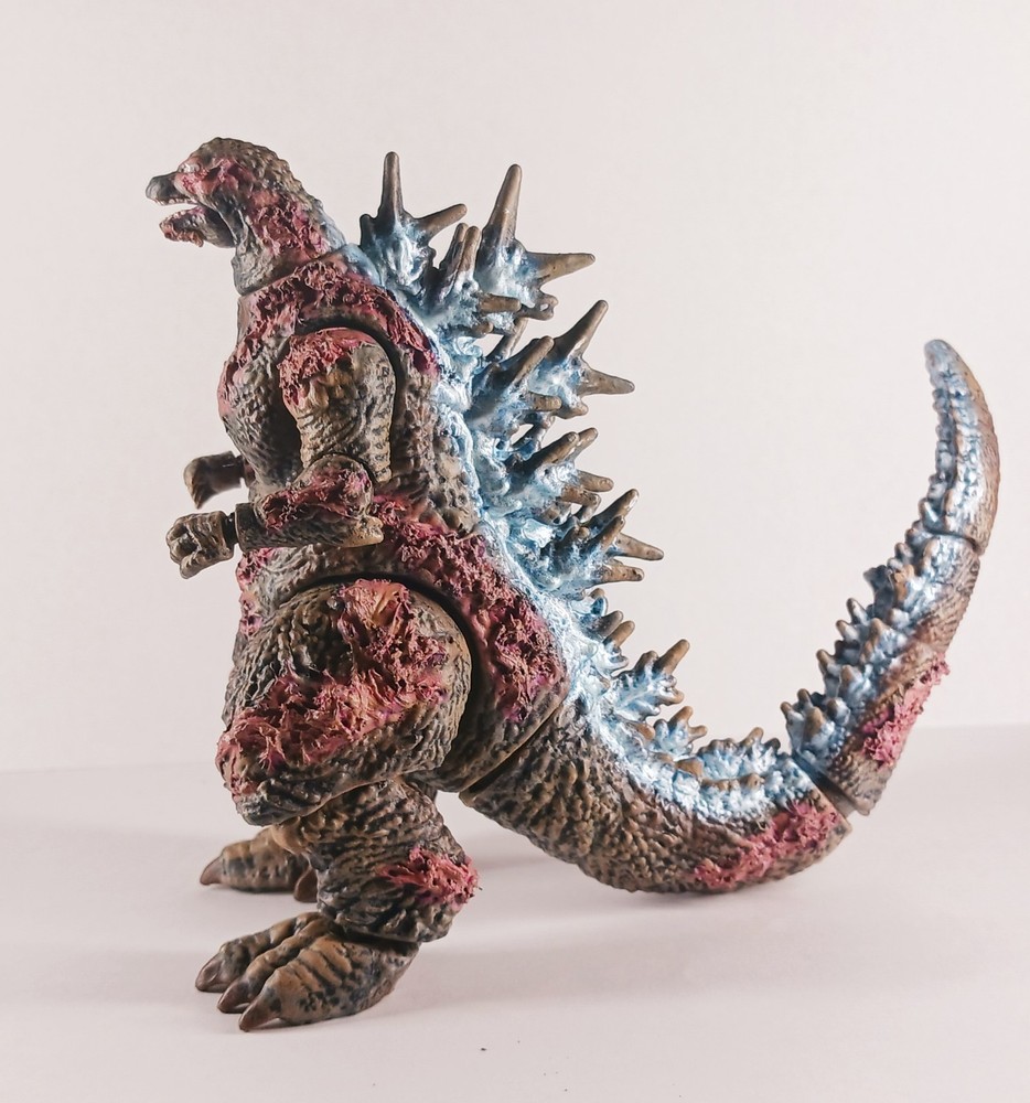 Bandai namco godzilla minus one action figure, repainted to give godzilla his look from the final scene of godzilla minus one, also has custom added on scars from when he forced down to the ocean floor and rise up again. the scars are made from sculpting hot glue on to the figure. the figure comes with an heat ray accessorie.