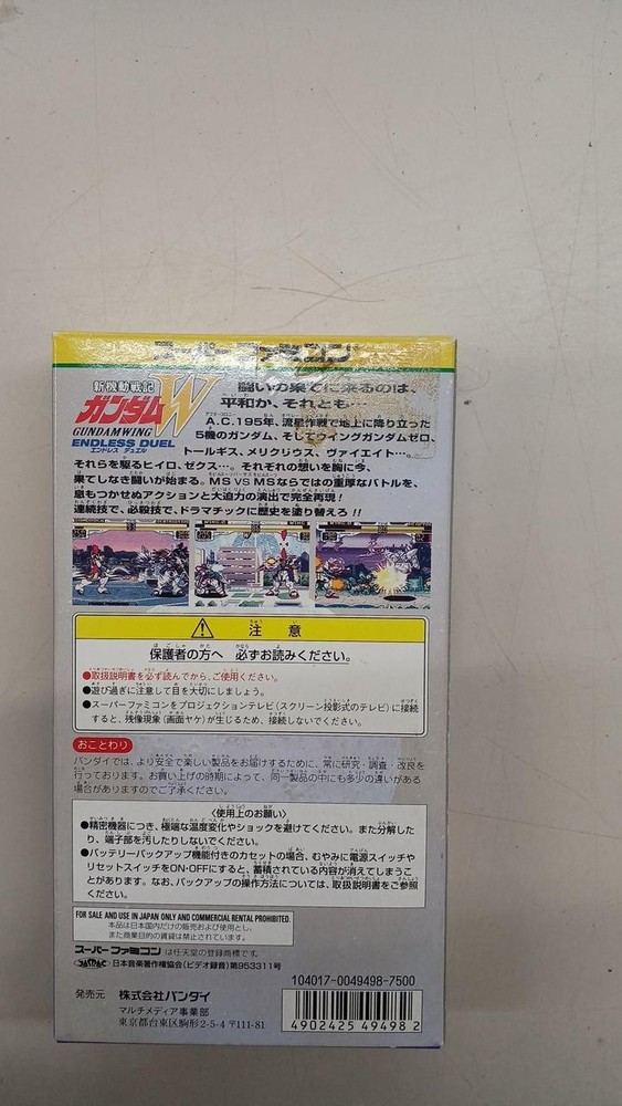 Bandai SHVC-P-AEDJ (JPN) New Mobile Report Gundam W Endless Duel 【This item includes applicable import fees. you won’t pay anything extra after checkout. Supported countries: USA only】 【Customs duties】 This item includes applicable import fees. you won’t pay anything extra after checkout. Supported countries: USA only (Does not include countries outside the United States) 【Item Description】 Because we have a large number of items, our product descriptions may be brief. The actual product will be exactly as shown in the image. Please feel free to ask any questions you may have before purchasing. 【Shipping】 Using standard shipping (Japan Post, FedEx or DHL), an estimated delivery date will be around 5-14 days after shipment. We send it with your tracking number, so that you can track the delivery status anytime. Shipping is only available to addresses registered on eBay. If you would like to send an item to a different address, please update your shipping address on eBay before you complete your purchase. 【Payment】 eBay's recommended payment methods are available. You will be able to pay with credit card, debit card, Apple Pay, Google Pay, or PayPal. 【For International Buyers(Excluding buyers from the USA)】 Import duties, taxes, and charges aren't included in the item price or shipping charges. These charges are the buyer's responsibility. Please check with your country's customs office to determine what these additional costs will be prior to bidding or buying. 【Caution】 Button/coin batteries can cause severe injuries or even death when swallowed. Keep batteries out of reach of children. If you suspect a child has swallowed or inserted a button/coin battery, seek medical attention immediately.