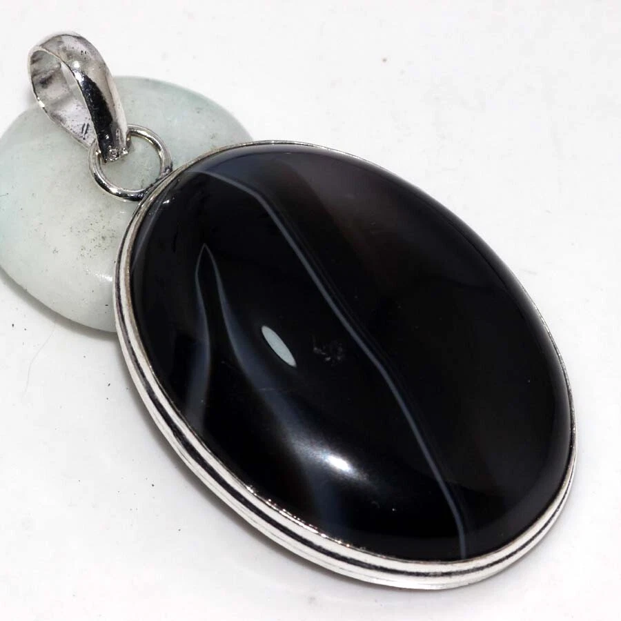 Banded Black Onyx 925 Silver Plated Pendant 2.1" Aesthetic Jewellery JW