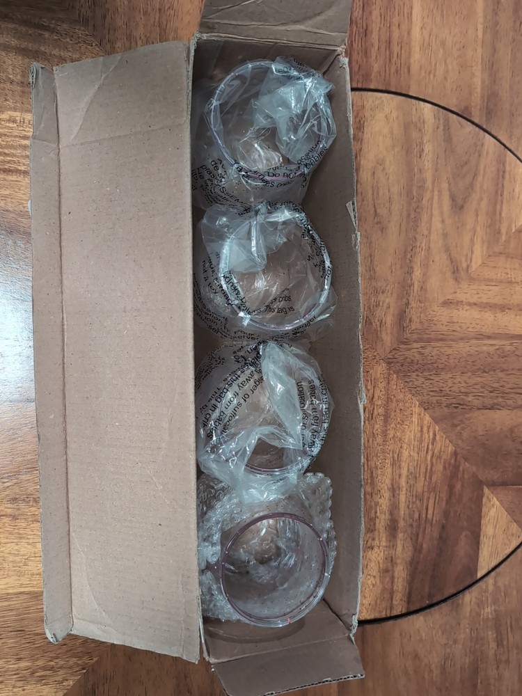 3 glasses are brand new never used/ wrapped in original plastic. It looks like 1 glass may have been used/removed from the original plastic. The box is original but has small blemishes.
