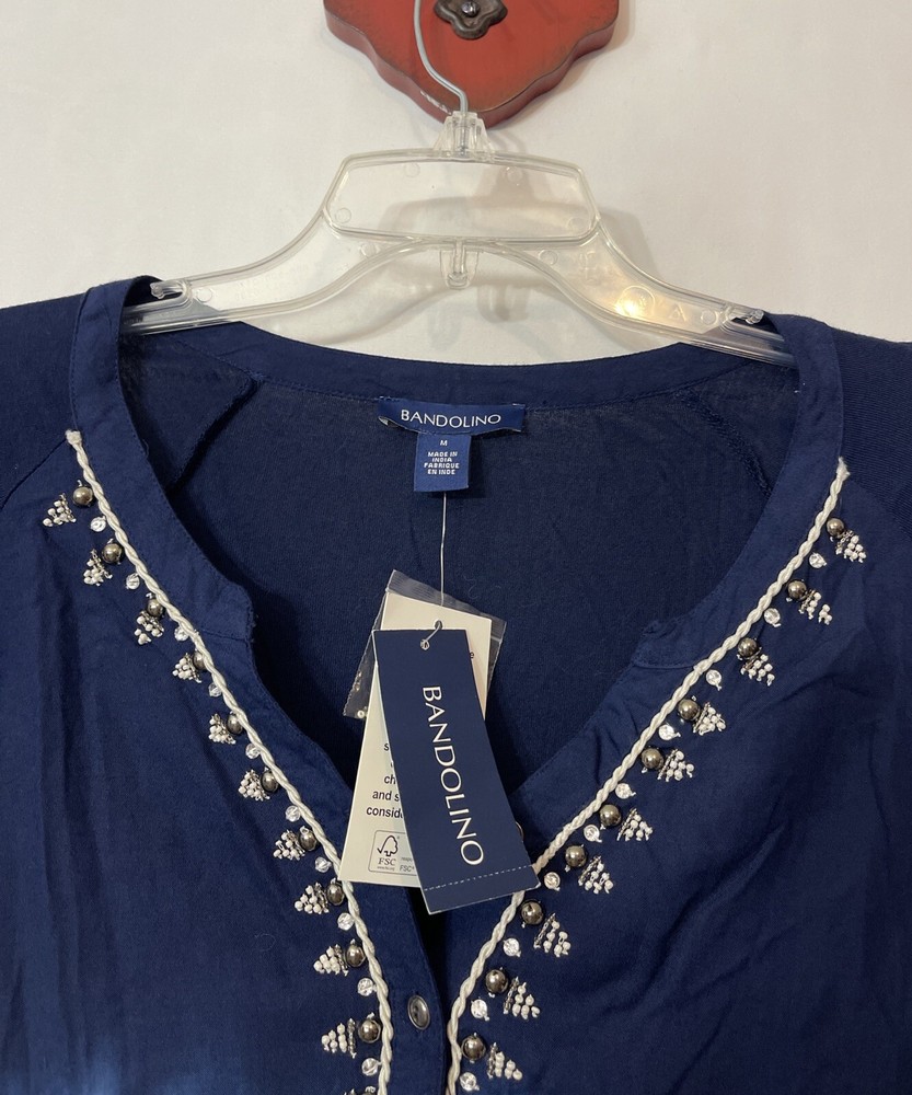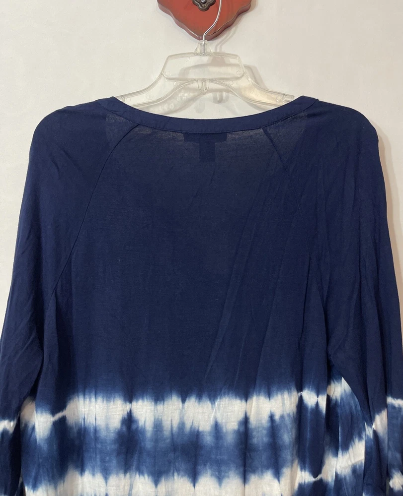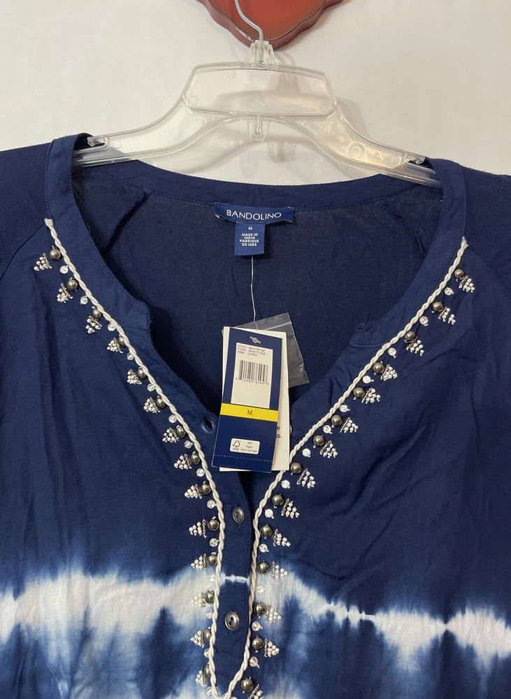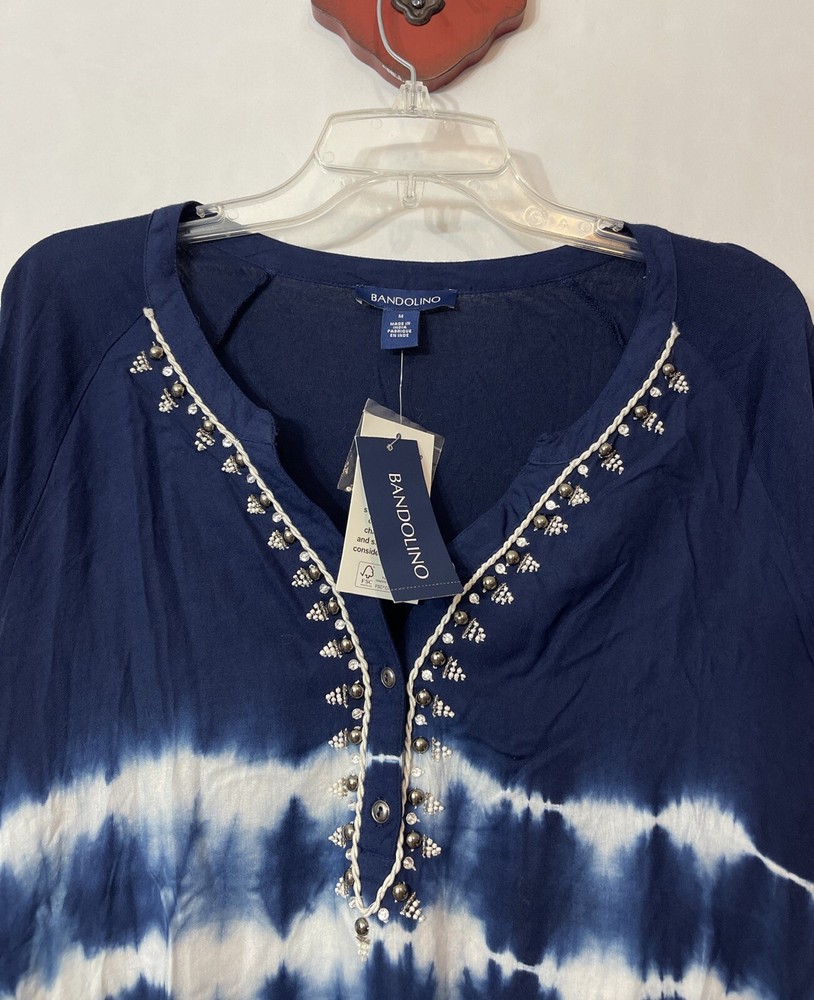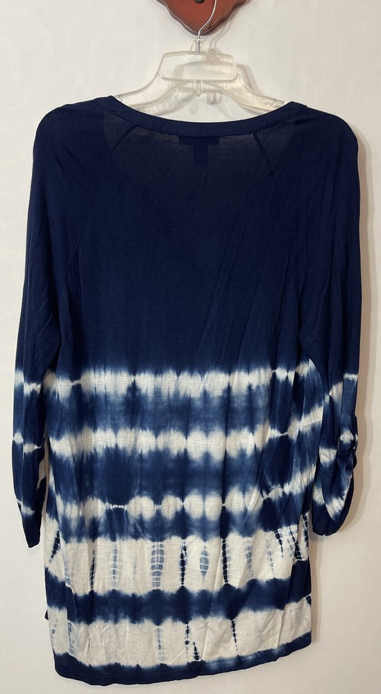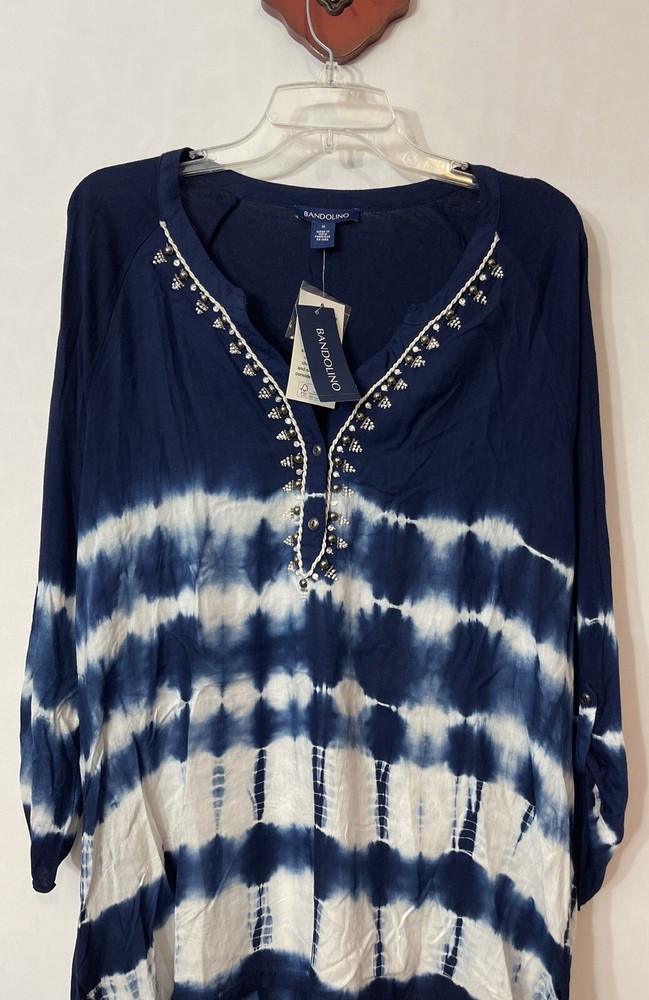Elevate your casual wardrobe with this stunning Bandolino tunic-style blouse. The beautiful blue tie-dye design and V-neckline make it perfect for any occasion. The 3/4 roll-tab sleeves and collarless feature add a touch of sophistication to this casual top. Crafted from breathable viscose material, this blouse is comfortable to wear in all seasons. The pullover closure and studded, beaded, and embroidered accents make it a designer piece. This blouse is perfect for women who love colorful and designer clothing. Length: 31 inches. Chest: 19 inches across laying flat.