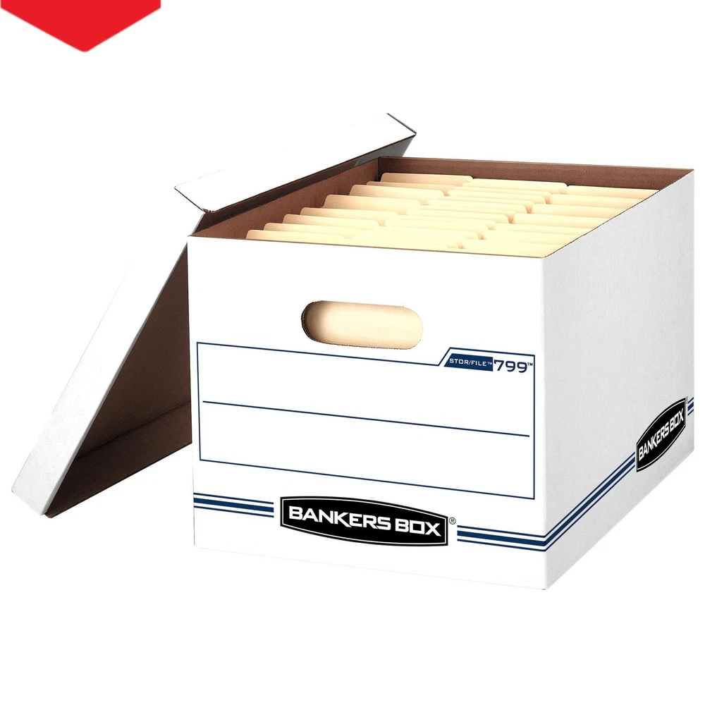 Free up space in any area using this Bankers Box file storage. It is ideal for organizing the office, home, dorm room and much more. The lift-off-lid boxes are easy to use and can be utilized for archiving receipts, tax papers, contracts and other important documents. Pack items for moving or give the closet a makeover. Each of these white storage boxes is ideal for moderate stacking, and the durable handles make them easy to transport. Basic-duty with 350 lbs. stacking strength. They measure 12""L x 10""W x 15""D and are available in a convenient 10-pack of file storage bins, so there are plenty to get the job done. Basic-duty, 350 lbs. stacking strength Standard set-up construction for moderate stacking with shelving 10 pack Assembled Dimensions: 10”H x 12”W x 15”D" Lift-off lid ships attached to prevent lid loss, then tears off for use Double wall, single wall construction