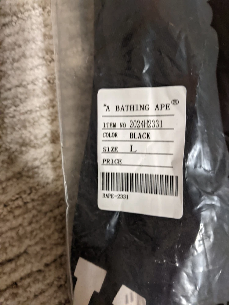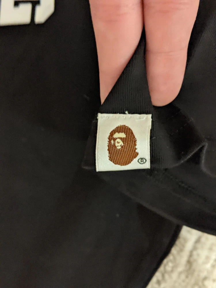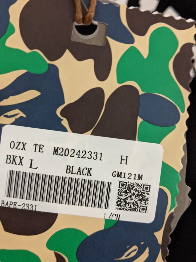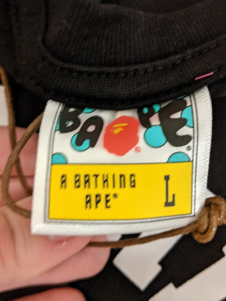 This Bape T-shirt is a must-have for any designer-loving person . Featuring a camouflage pattern and short sleeves, this black cotton shirt is perfect for all seasons. The crew neck and regular fit make it a comfortable and stylish choice for men, while the A Bathing Ape brand adds a touch of uniqueness. The shirt is available in size Large . Whether you're a fan of the movie or just love the design, this T-shirt is a great addition to your wardrobe.