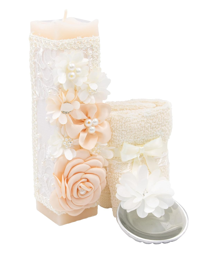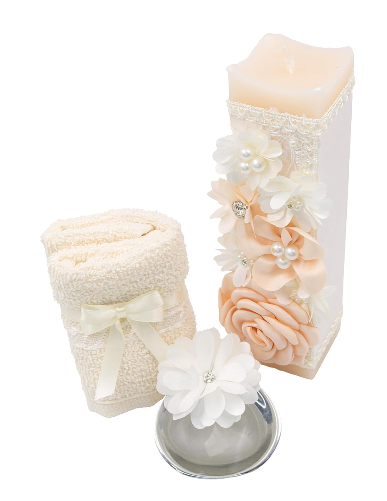 Baptism Set Girl in Beige Melon Color Baptism Candle Kit Bautizo Para Ni A White cardboard box 9 x 6.5 x 3.5 in Pewter shell 3 x 3 in Square candle 1.8 x 7.5 in 100% cotton towel Beautiful baptism kit for a girl in beige color and decorated with flowers in melon and beige tones. It includes a cotton towel ideal for drying the baby's head and a pweter (metal) shell with which the priest imposes the baptismal water on the baby. Delivered in an a white cardboard box with transparent mica lid. Simply elegant! Hermoso kit de bautizo para niña en color beige y decorado con flores en tonos melón y beige. Incluye una toalla de algodón ideal para secar la cabeza de la bebe y una concha de pweter (metal) con la que el sacerdote impone el agua bautismal al bebe. Se entrega en una caja de cartón blanco con tapa de mica transparente. Simplemente Elegante! Color Cappuccino Production Method This product is a handicraft that is made by Mexican hands, who put their soul and heart in each of the details that you can appreciate. In these details, Mexican culture and traditions are expressed, which, in the particular case of religious festivities, are manifested in a beautiful and elegant way through the creativity of Mexican artisans. When you buy this product, not only do you get excellent quality handicraft, but you are also taking a little bit of Mexican culture with you. Material Wax Package Dimensions 9 x 6.5 x 3.5 inches; 1.4 Pounds Size 9 x 6.5 x 3.5 in Complimentary Shipping and Easy Returns Need to return something? Enjoy our 30-day hassle-free return policy! Take advantage of free shipping across all 48 contiguous states! Your order will be dispatched within 1-2 business days once payment is confirmed. Your Opinion Matters! Your happiness is our main goal! We welcome your feedback! If you encounter any problems, reach out to us right away, and we’ll be here to help. Explore the Extraordinary! Our collection showcases fascinating products that are sure to capture your attention. What surprises await you? Delve in and discover unique items that enrich your daily life. Don't miss the amazing things we have in store for you!