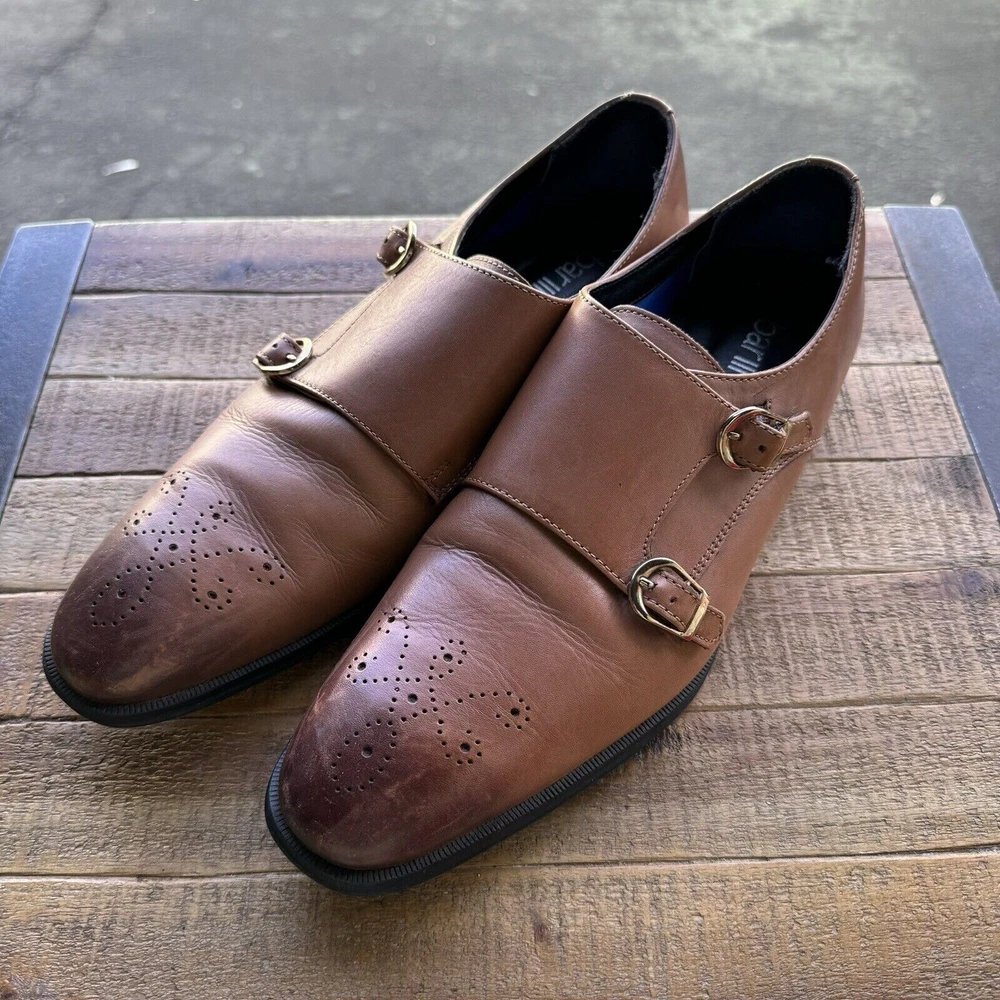 This is a Bar III Carrick Monk Strap Leather Dress Shoe in Tan for Men's size 9. It features a solid color brown design, a monk strap style with straps, and is made of leather. This shoe is suitable for formal occasions and would complement a professional or dressy outfit. Shipped with USPS Ground Advantage.