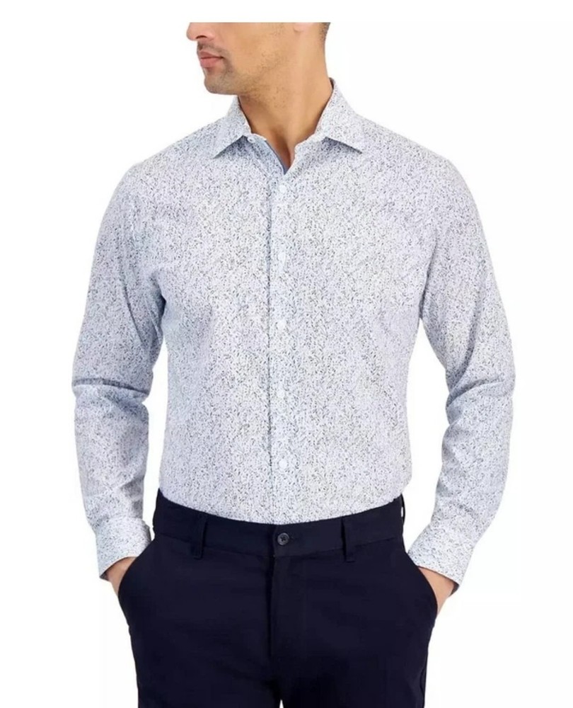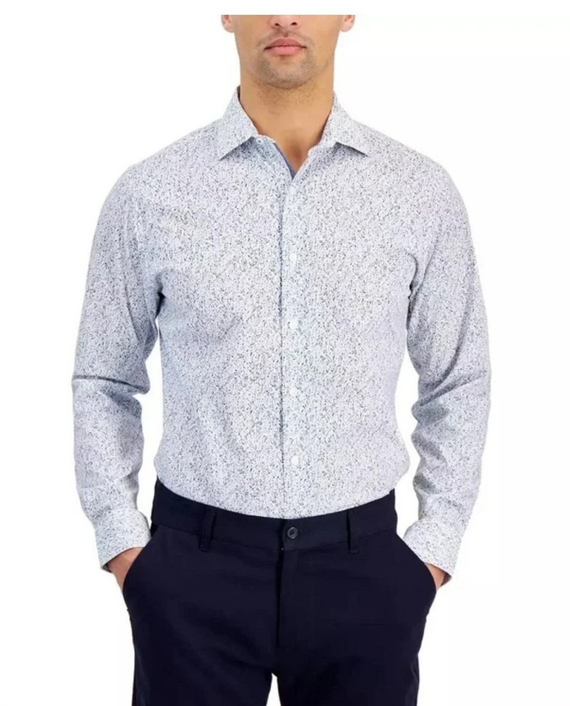 The Bar III Men's Slim-Fit Floral Dress Shirt in White Blue, size S, is a stylish and sophisticated choice for men looking to make a statement with their outfit. Made from a blend of polyester, spandex, and cotton, this shirt offers a comfortable and high-quality fit. The slim fit and point collar add a modern touch to the classic dress shirt design, while the white color and vine pattern give it a versatile and elegant look. Perfect for both formal occasions or smart-casual events, this shirt is a wardrobe essential for any fashion-conscious man.