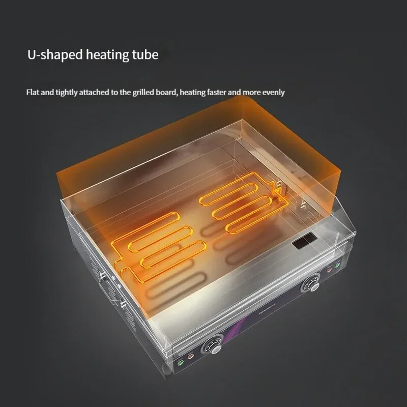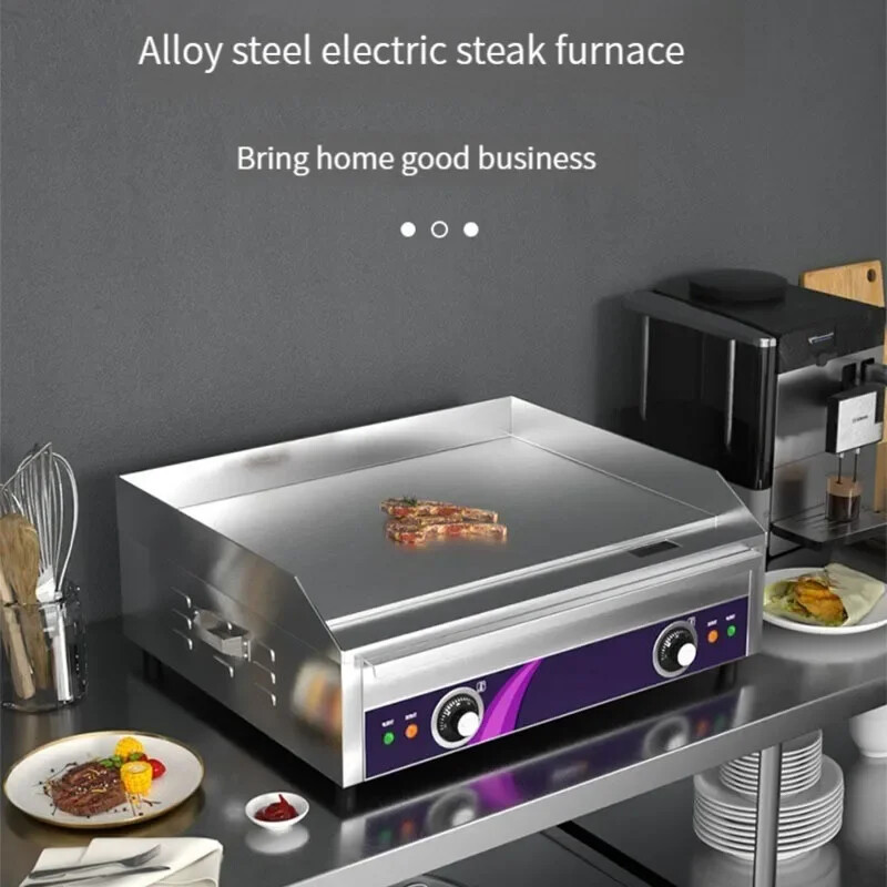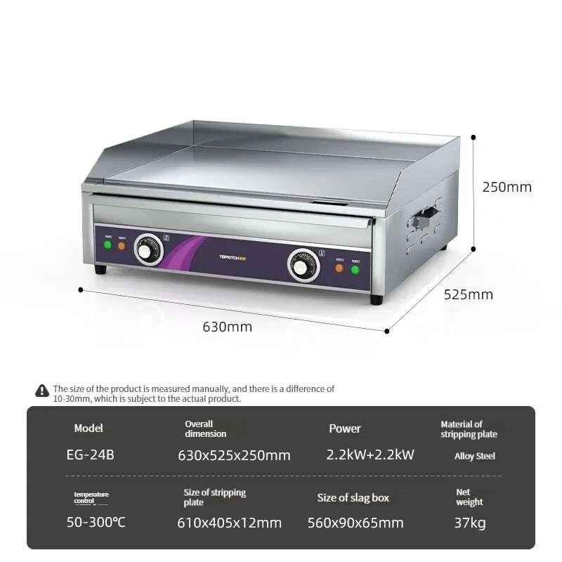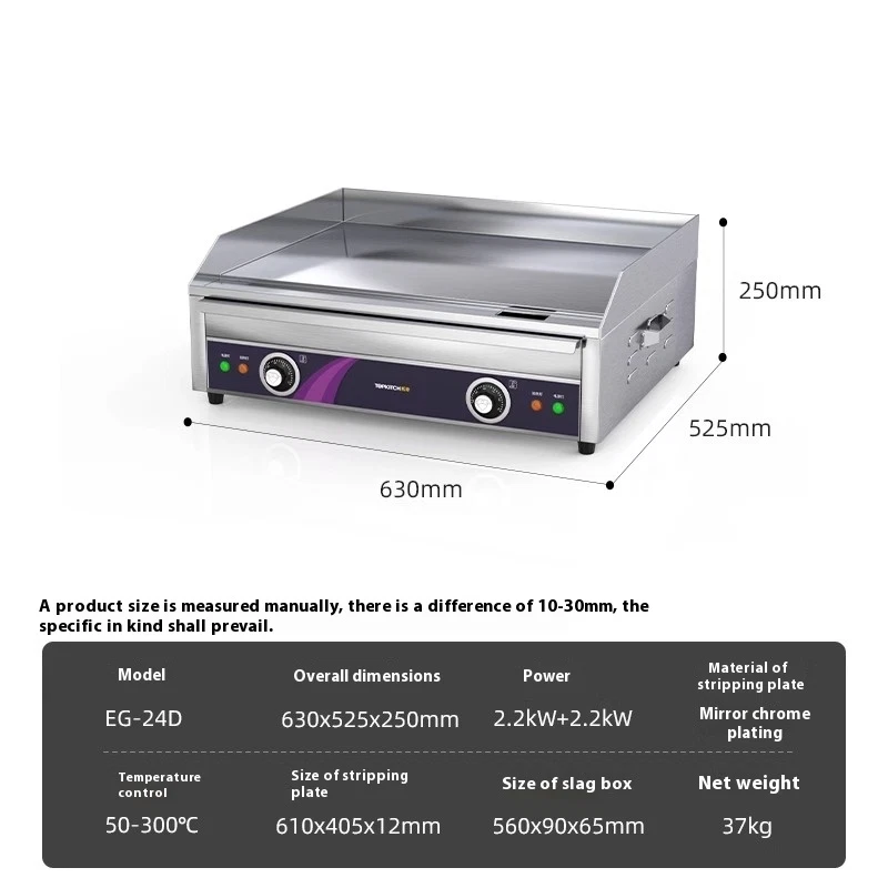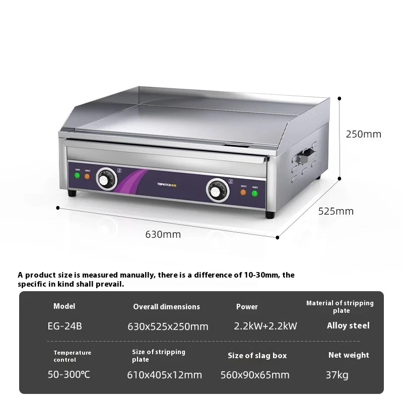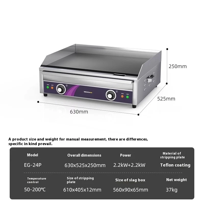 Hand pie machine commercial enamelled teppanyaki teppanyaki squid tofu machine teppanyaki electric grill commercial Temperature control range: 50~300 ° C Net weight of product 37kg Power 2.2+2.2 kW Overall dimension 630x525x250mm Grill plate size 610x405x1 2mm Slag receiving box size 560x90x65mm Gripper plate material: alloy steel