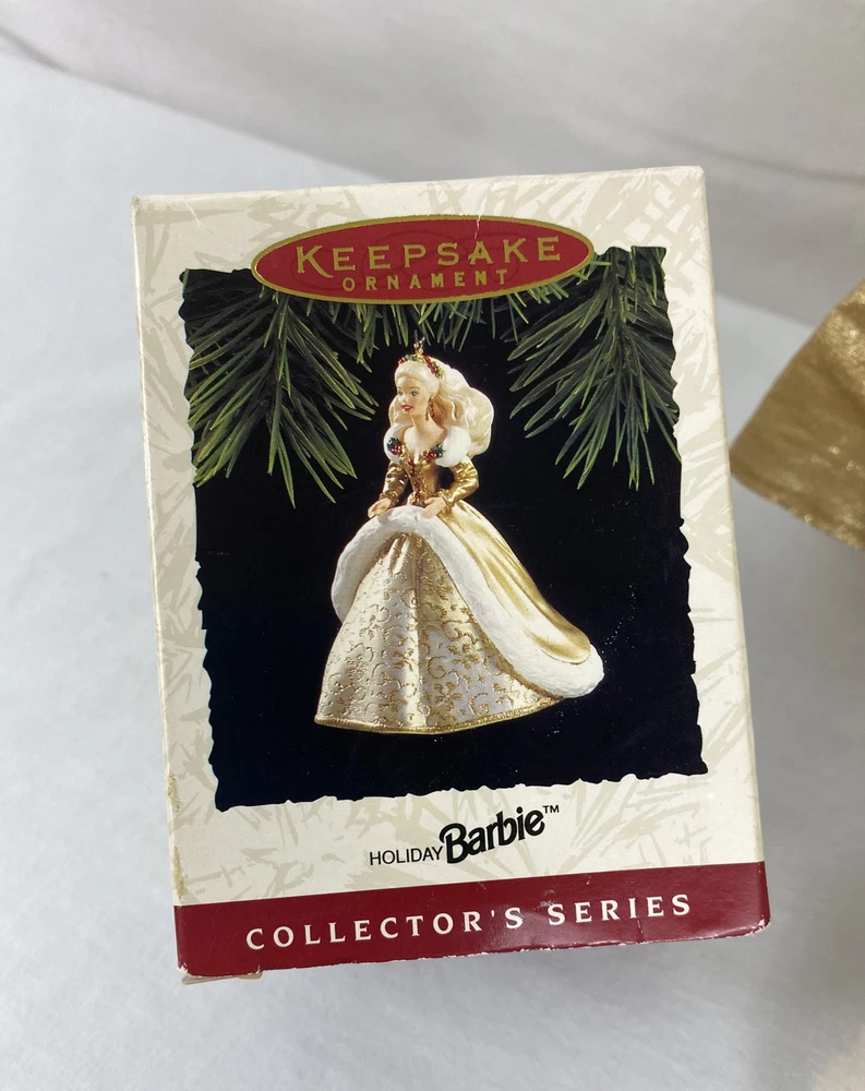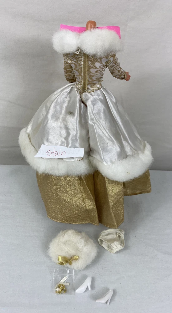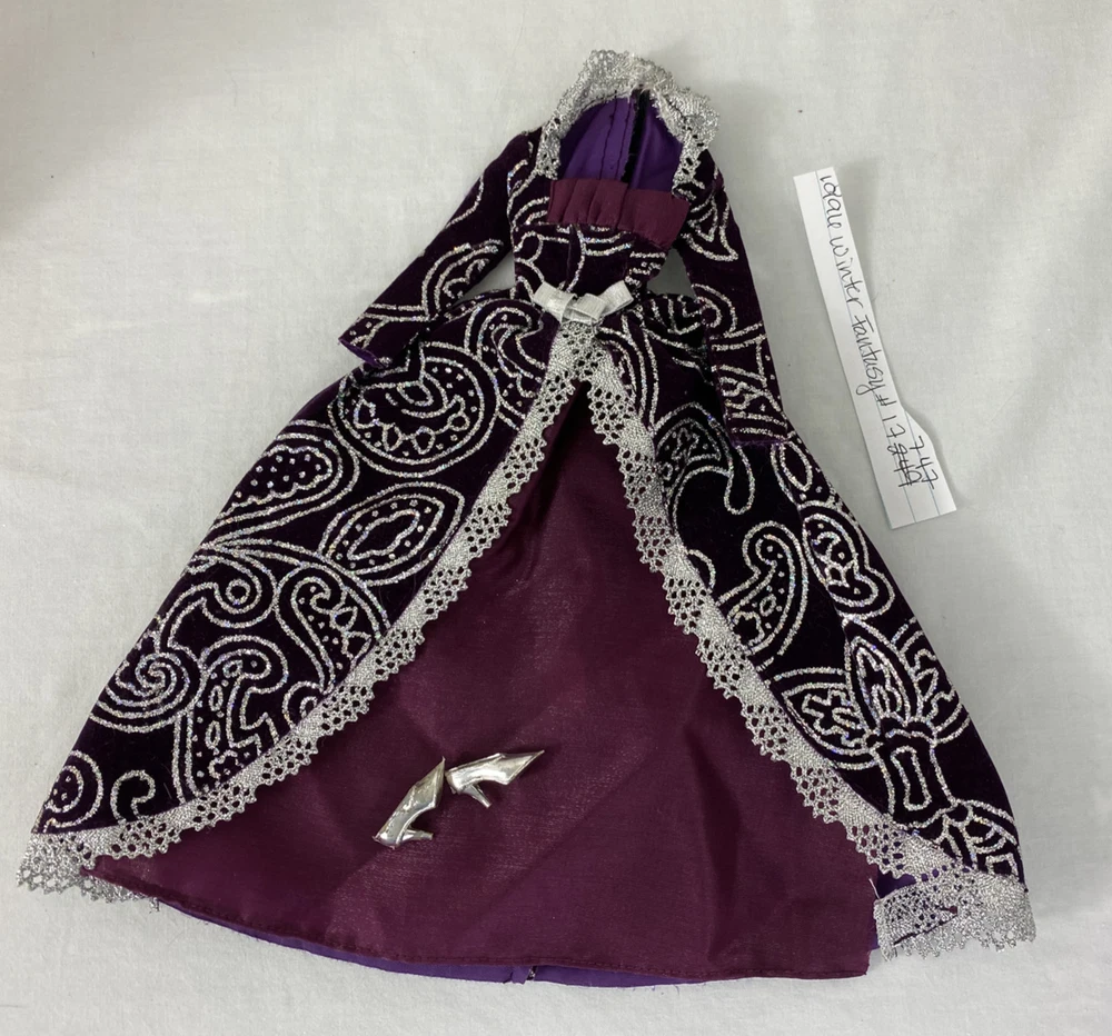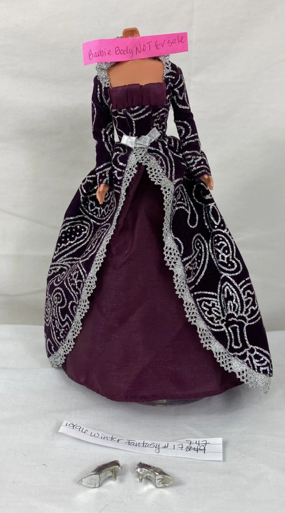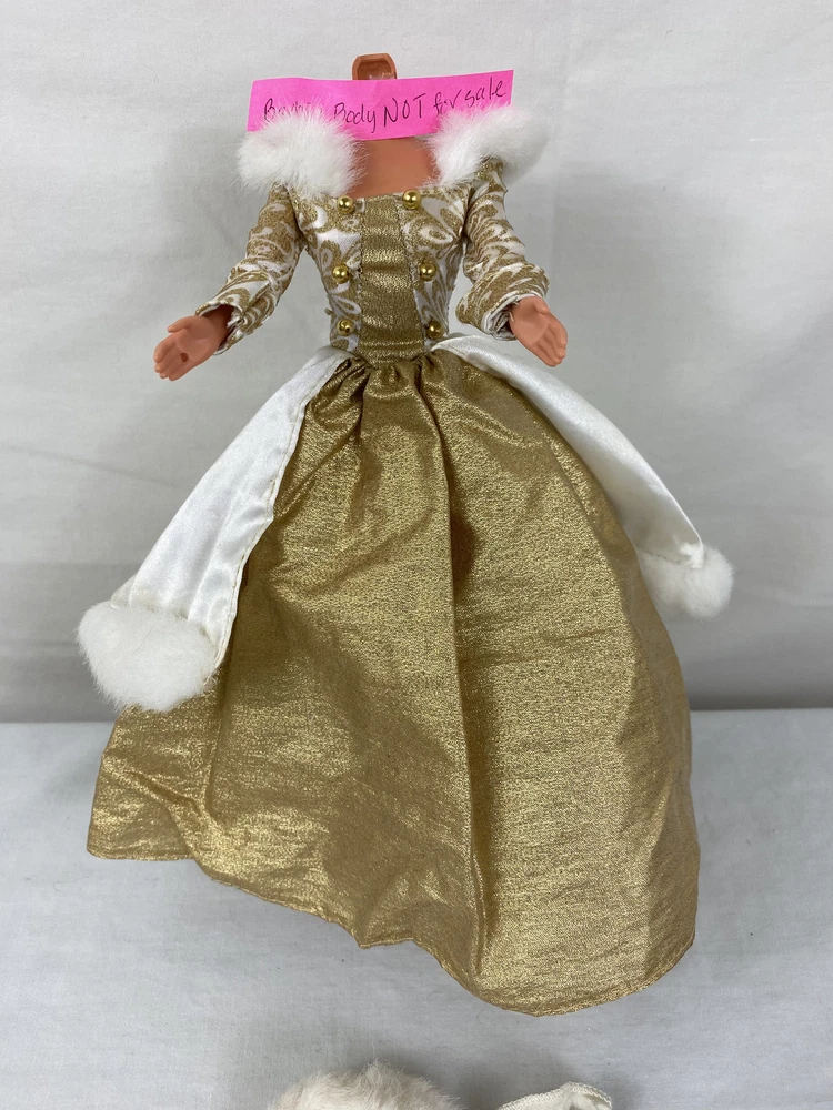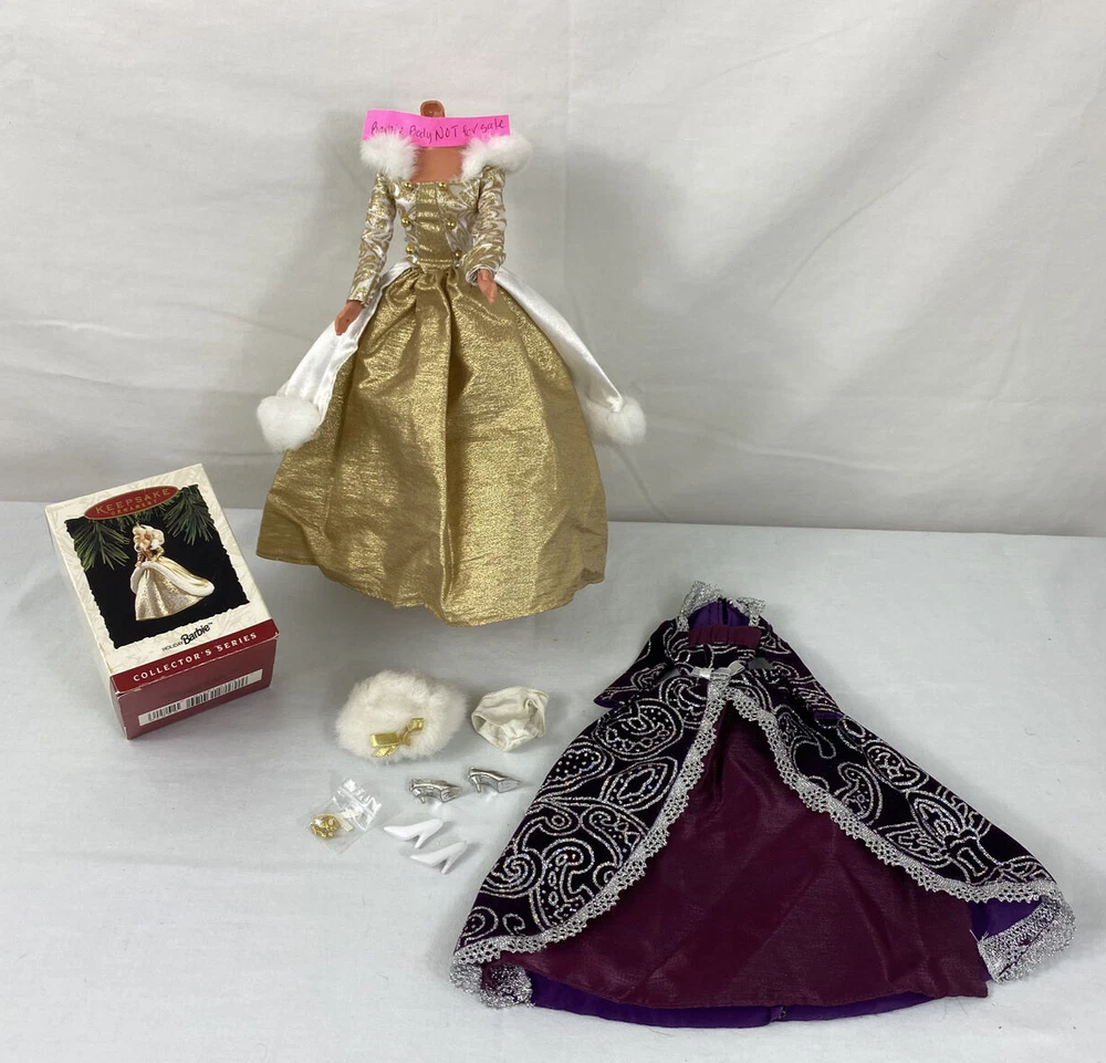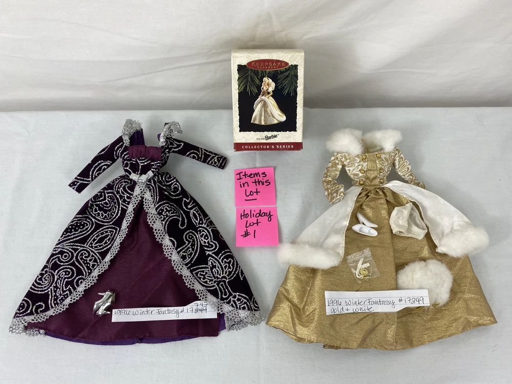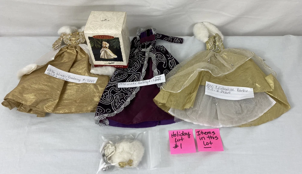 This product is a lot of two Barbie dolls dresses; one in gold and white the other in maroon and silver. Winter Fantasy gowns, along with a 1994 Barbie Hallmark Keepsake Holiday Ornament are complementary to any collection. The dresses are compatible with a 12in size doll/Barbie and are original, licensed reproductions from the Barbie Holiday product line. The gowns are made of cloth, the ornament is plastic, and glitter, and the ornament is in its original packaging. The lot is perfect for celebration occasions and features lightweight dolls with a fashion doll type. The dolls are from the 1990-1999 time period and were manufactured in Indonesia. See pictures as they are part of the description. More pictures available. Sold as is.
