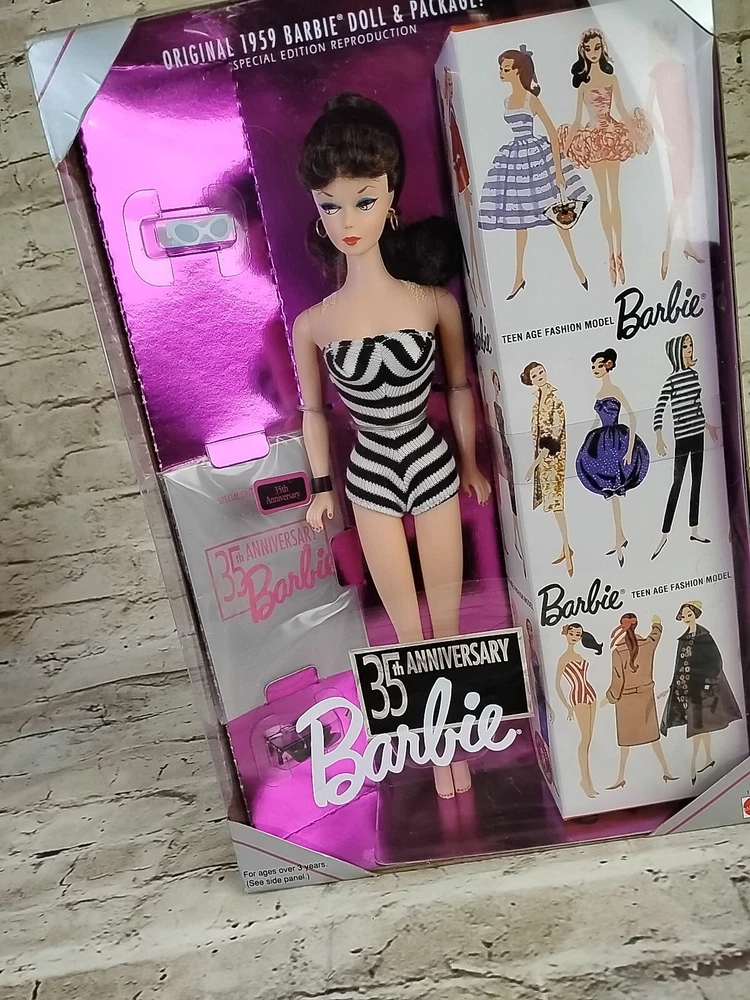 Celebrate a milestone in toy history with the Barbie 35th Anniversary Brunette doll, a charming reproduction of the 1959 original. This special edition doll, numbered #11782 and manufactured in 1993, comes new in box, preserving the timeless beauty and elegance that Barbie has been known for over the decades. With dark brown hair and a light complexion, this 11.5" fashion doll is dressed in removable attire, showcasing the sophistication of the era and the quality craftsmanship of Mattel. Included in this set are the doll and its accessories, all presented in the original, unopened packaging. This collectible Barbie, a part of the Anniversary Dolls product line, is a must-have for enthusiasts and collectors. It's not just a toy; it's a piece of history that captures the essence of fashion and beauty across generations. Whether for display or play, this Barbie is a treasure for anyone who appreciates the blend of nostalgia and style.