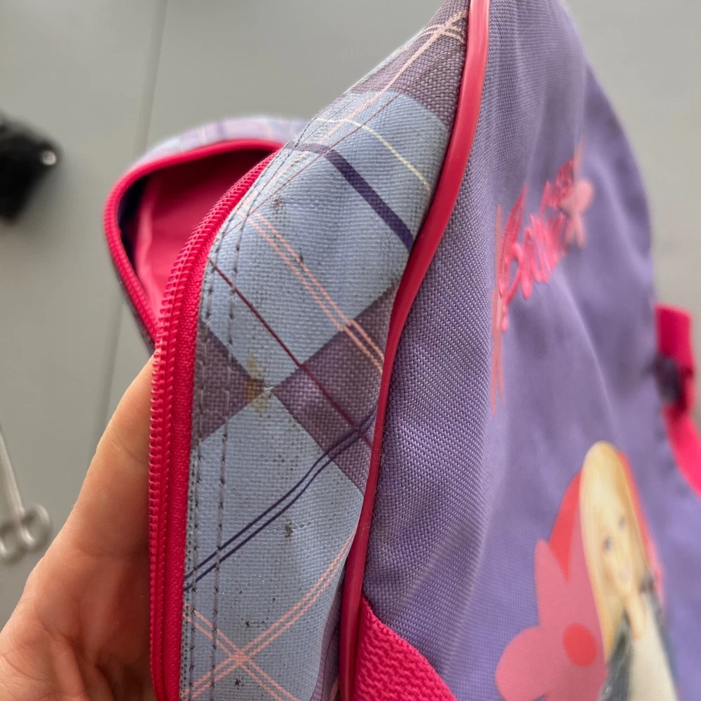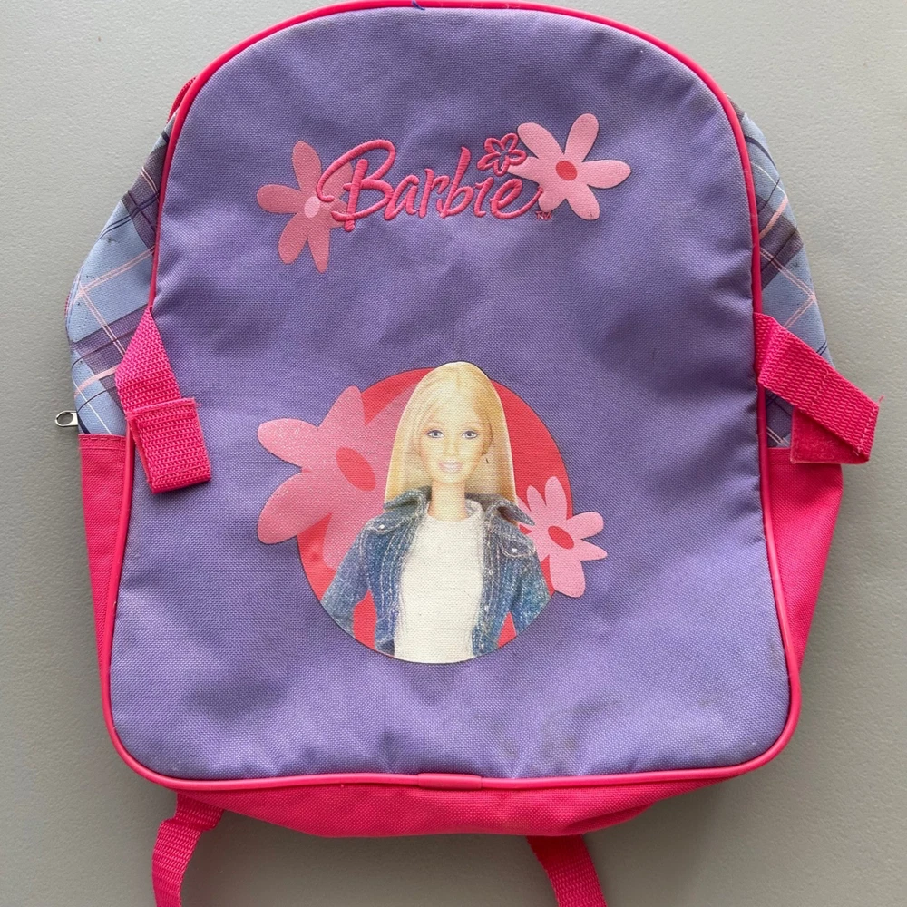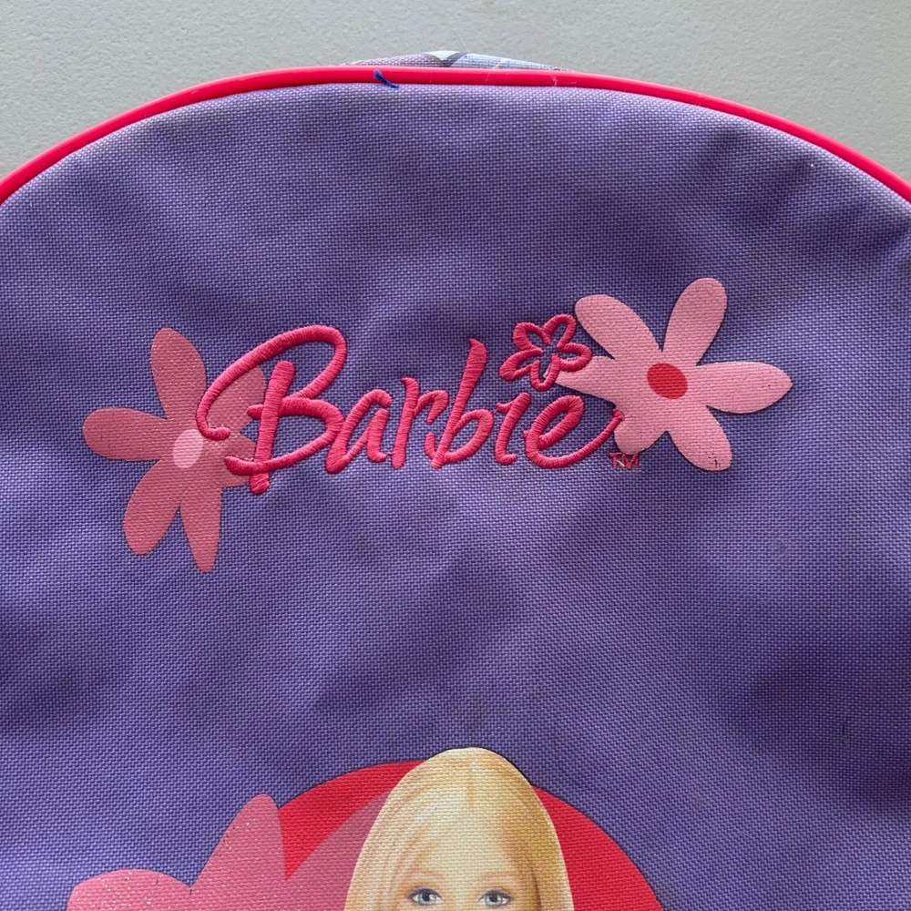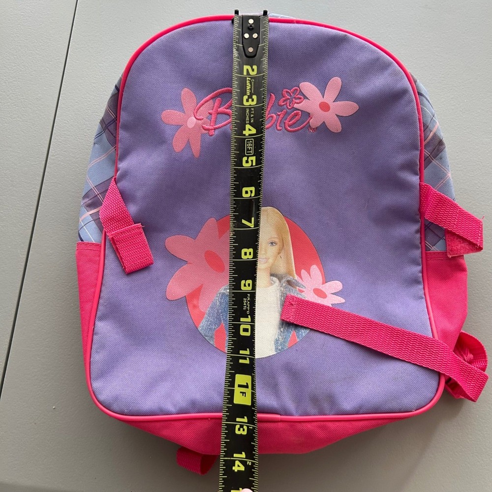 Vintage 2004 Barbie backpack features a vibrant purple and pink color scheme with a classic Barbie graphic and embroidered logo. The design includes a stylish plaid trim along the sides and adjustable pink shoulder straps for a comfortable fit. The interior is spacious with a bright pink lining, perfect for school or travel. This item shows some minor signs of wear consistent with its age, including small spots on the fabric as shown in photos. Measurements: • Height: 14" • Width: 12" Y2K, Barbiecore, Kidcore, Nostalgia, 2000s, Aesthetic, School Bag, Retro, Pink, Purple, Plaid, Girly, Mattel, Vintage Barbie Brand: Barbie Product Type: Backpack Audience: Girls Size: Small/Medium Color: Purple/Pink Material: Polyester Year: 2004 Closure: Zip Pattern: Plaid/Graphic Features: Adjustable Straps All items come from a smoke free, golden retriever dog friendly home. All of items unless NWT or Dry Clean Only are washed with Tide. We try our best to disclose any flaws with items, if we miss something please reach out and let us know.