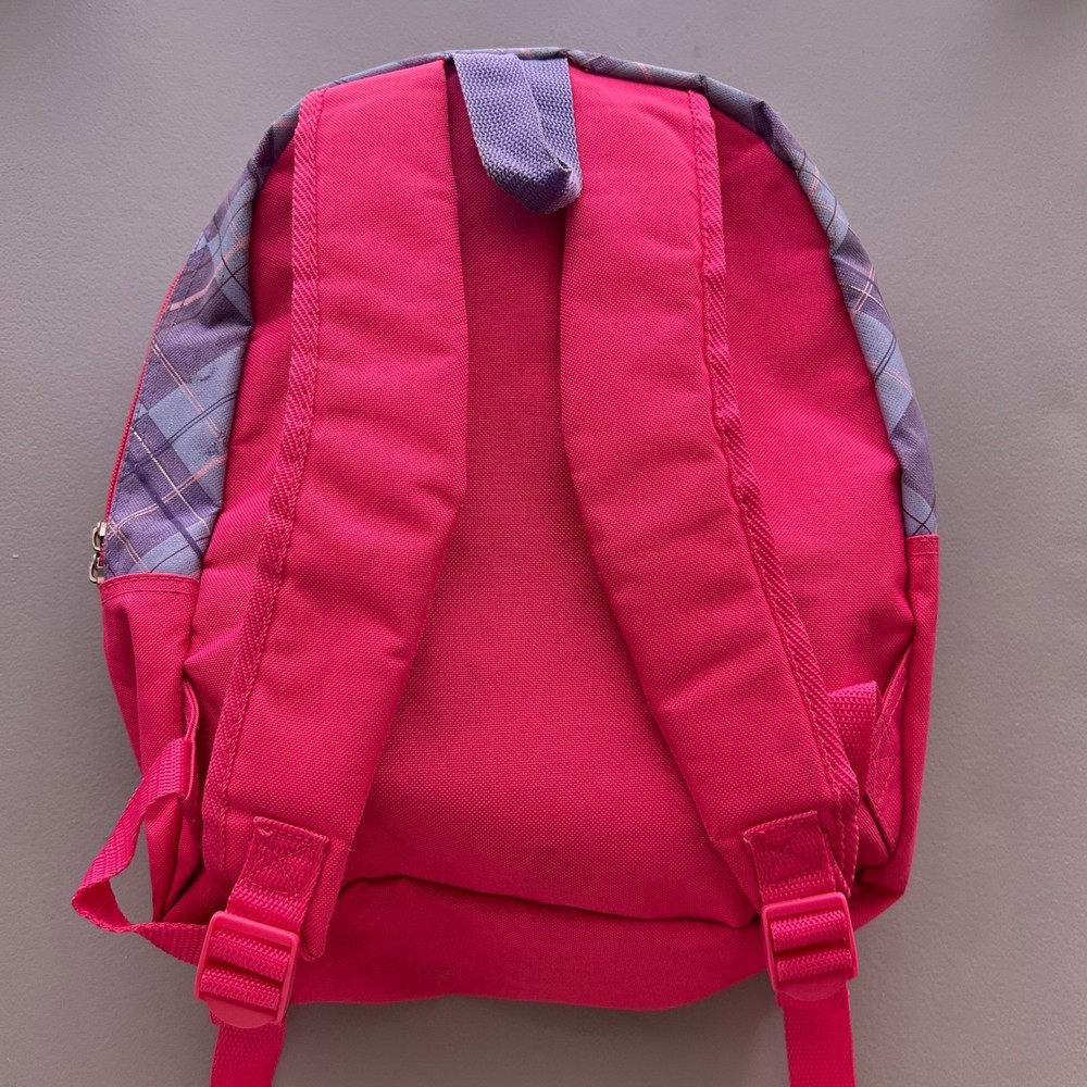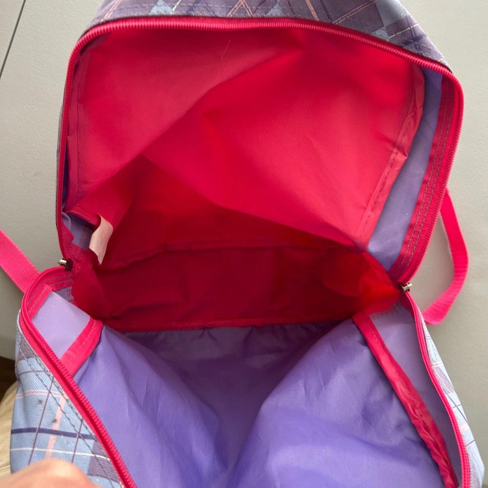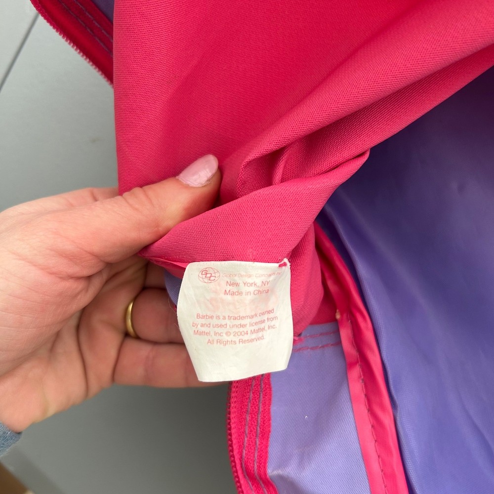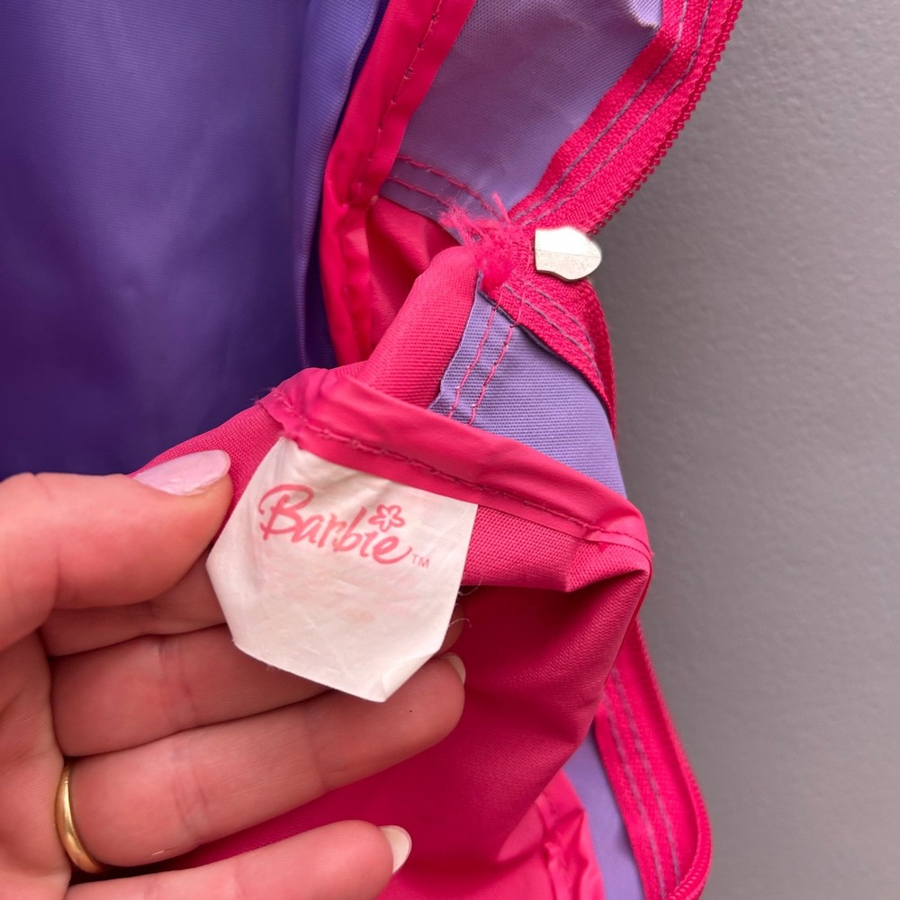 Vintage 2004 Barbie backpack features a vibrant purple and pink color scheme with a classic Barbie graphic and embroidered logo. The design includes a stylish plaid trim along the sides and adjustable pink shoulder straps for a comfortable fit. The interior is spacious with a bright pink lining, perfect for school or travel. This item shows some minor signs of wear consistent with its age, including small spots on the fabric as shown in photos. Measurements: • Height: 14" • Width: 12" Y2K, Barbiecore, Kidcore, Nostalgia, 2000s, Aesthetic, School Bag, Retro, Pink, Purple, Plaid, Girly, Mattel, Vintage Barbie Brand: Barbie Product Type: Backpack Audience: Girls Size: Small/Medium Color: Purple/Pink Material: Polyester Year: 2004 Closure: Zip Pattern: Plaid/Graphic Features: Adjustable Straps All items come from a smoke free, golden retriever dog friendly home. All of items unless NWT or Dry Clean Only are washed with Tide. We try our best to disclose any flaws with items, if we miss something please reach out and let us know.