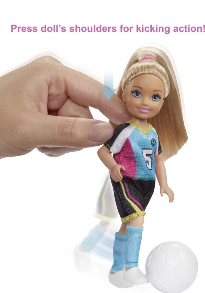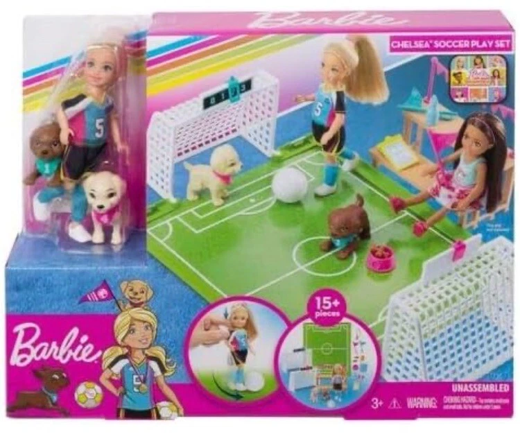 Barbie Dreamhouse Adventures Chelsea Doll Soccer Playset Blonde hair Blue eyes. Playset includes: Two goals, each with an adjustable scoring board, attach to a field area where Chelsea can practice and play -press down on her shoulders for "kicking" action! Two puppy friends with sporty bandanas can join in the fun, and a set of bleachers provides seating for fans and friends (not included). Includes storytelling accessories, like a gold medal, backpack, water bottle, snacks and a ball. Chelsea doll is game-ready in a colorful soccer jersey with sporty stripes, matching shorts, shin guards and shoes Shipping costs includes supplies plus postage