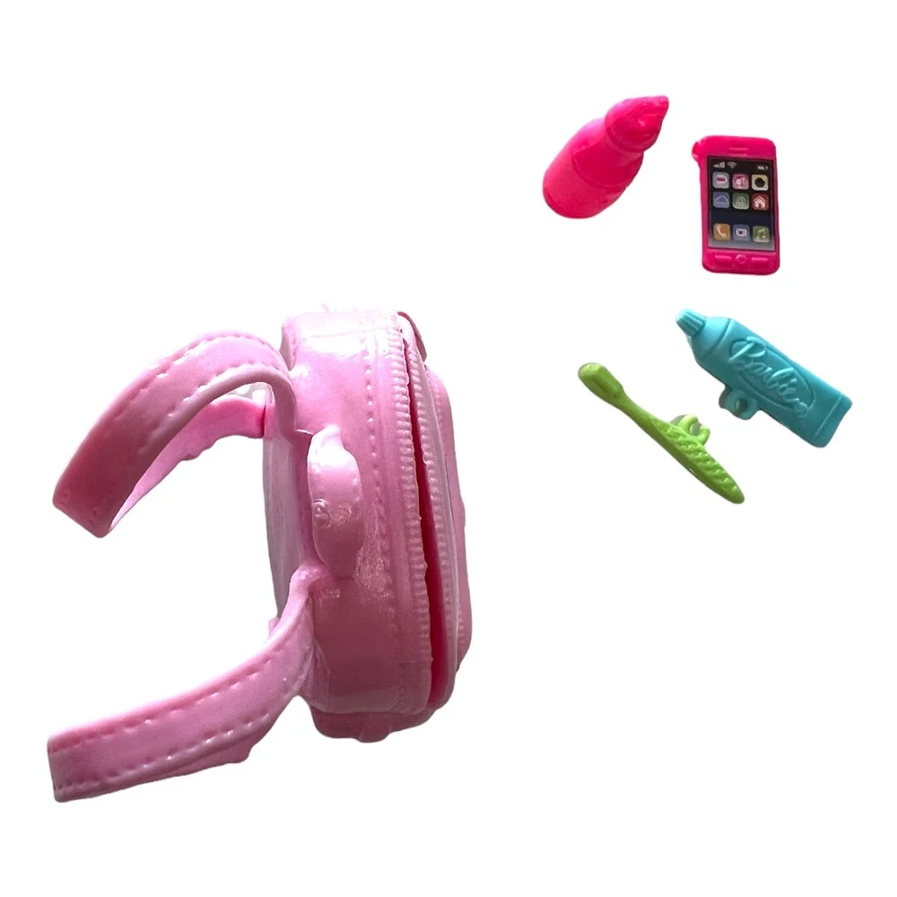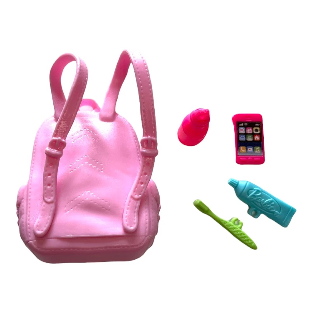 Barbie Doll Bag Accessories Pink Back Pack Mattel - With Accessories (toothbrush, toothpaste, phone, water bottle). Item will ship via USPS Ground Advantage Mail.