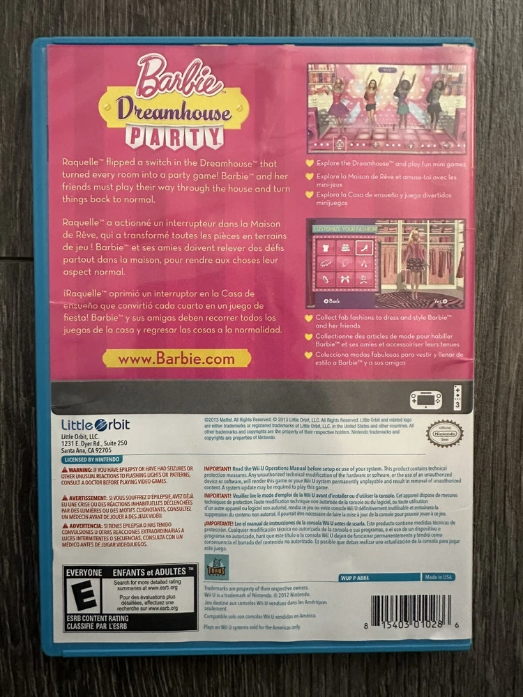 Get ready for a fun and exciting party with Barbie Dreamhouse Party for Nintendo Wii U! This game, released in 2013, is perfect for fans of action and adventure games. With an E-Everyone rating, it's suitable for players of all ages. This game, published by Little Orbit, is designed for the NTSC-U/C (US/Canada) region code and is compatible with Nintendo Wii U platform. Get your hands on this game and join the fun with Barbie and her friends! 9-23-24
