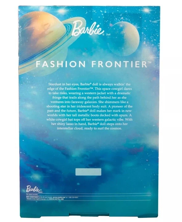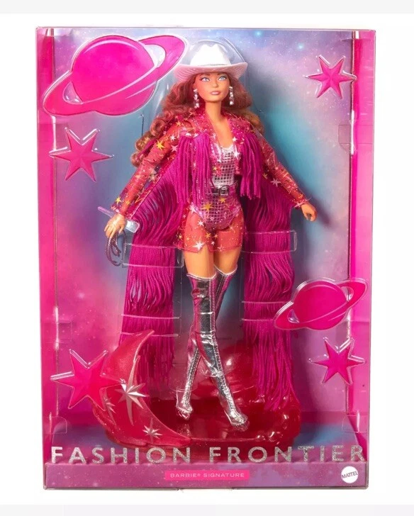 Introducing the Barbie Fashion Frontier doll, a limited edition collector's item from the Barbie Signature Black Label series. This beautiful 12-inch fashion doll features wavy curls and blue eyes, with a light complexion and multicolor highlights. The doll comes with a stand, outfit, and authenticity certificate, and is packaged in its original unopened box. Created by Taylor Pierce, this Barbie doll is perfect for all occasions and is a must-have for any Barbie collector. It is made of high-quality materials including polyester, plastic, PVC Eva Abs, spandex, and vinyl. This doll is not only a great addition to your collection but also a perfect gift for teens and adults alike.