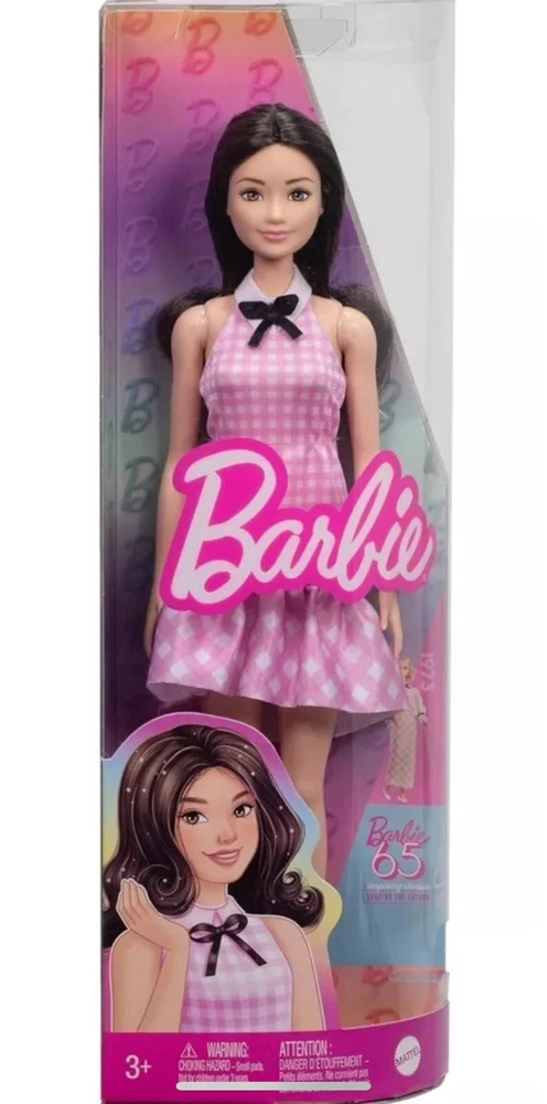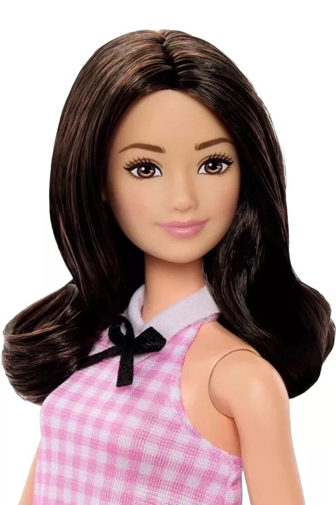 This is a NIB Barbie Fashionistas #224 doll with black wavy hair wearing a pink gingham dress and white shoes. The doll is made by Mattel and is approximately 11" fashion doll with brown eyes. It was manufactured in 2024 and is part of the Barbie character line.