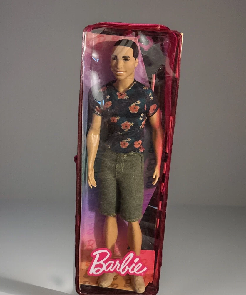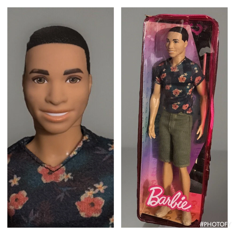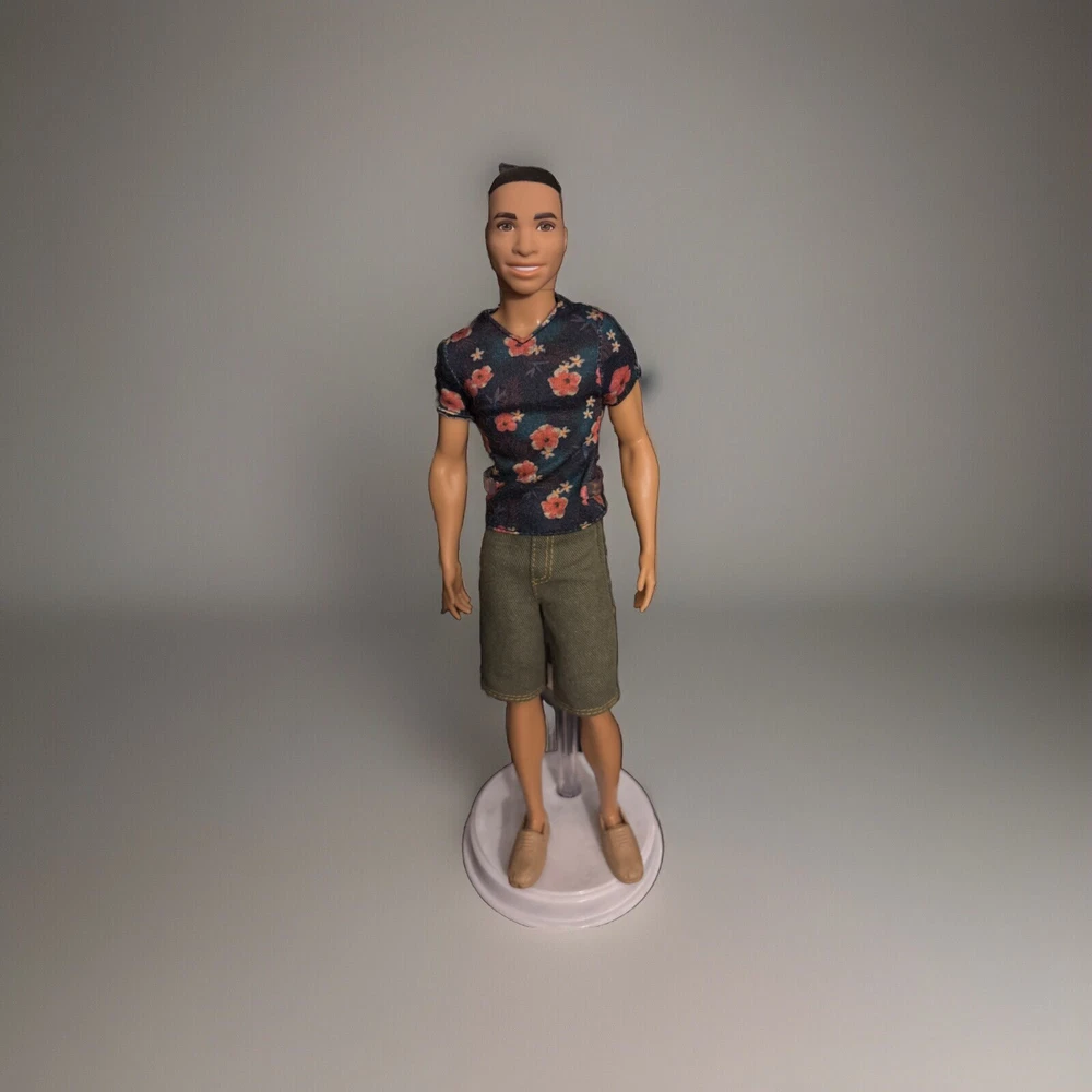 Barbie Fashionista Doll #4 Floral T Shirt, green shorts and tan shoes. Doll has been secured to new cardboard backing and repackaged in an authentic Barbie Plastic Case. Doll had never been played with. Original packaging too damaged for resale.