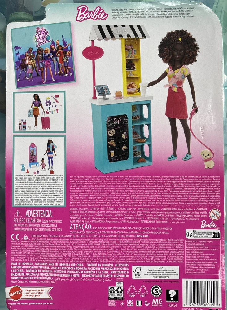 This is a new in box Mattel Barbie Life in the City playset featuring an African American Barbie doll with brown curly hair. The set includes a dog, various accessories, play food, and a dining set. The doll is 12 inches tall and part of the Barbie franchise, suitable for ages 3 and up. The theme is centered around careers, and the product line is Barbie Life In The City, manufactured in 2022.