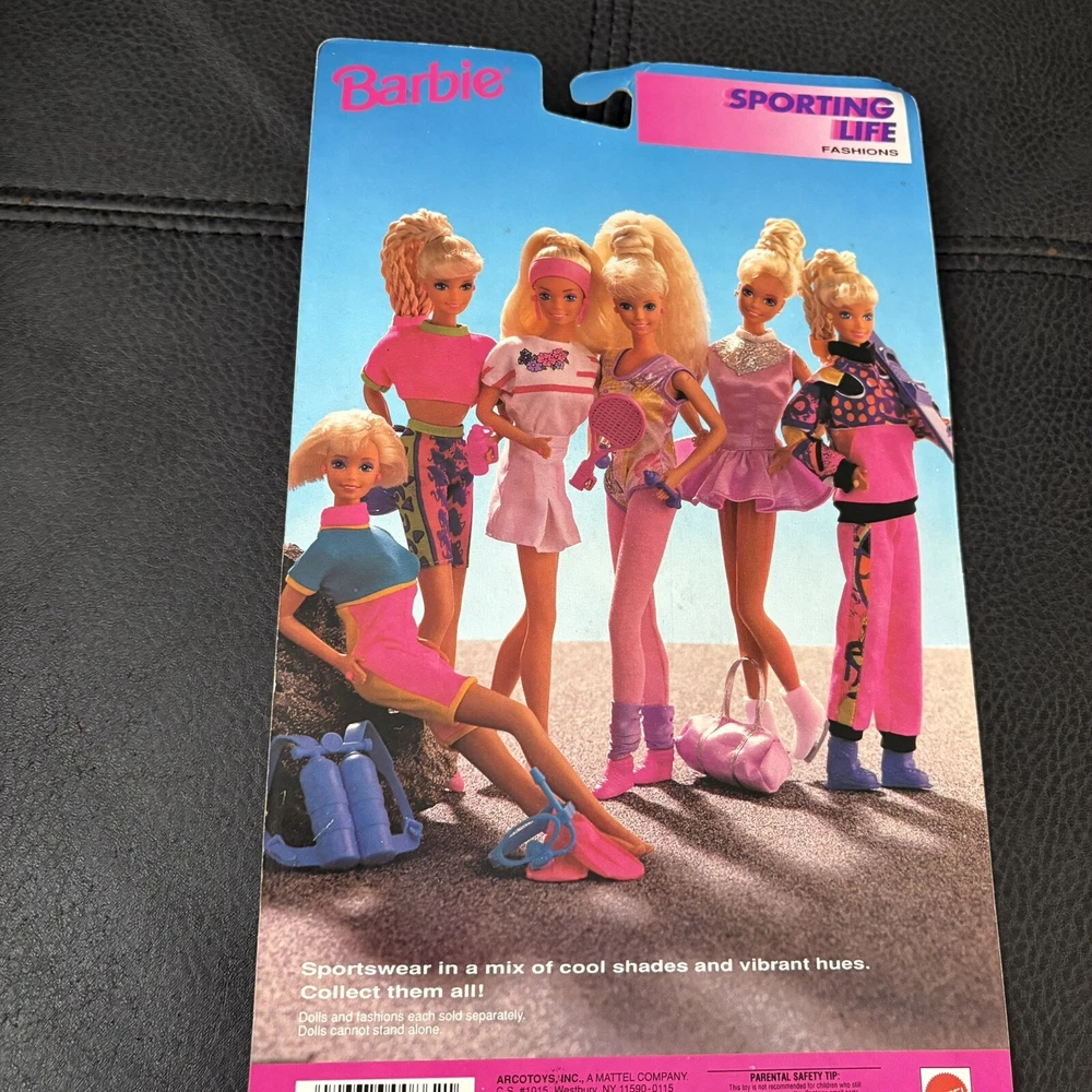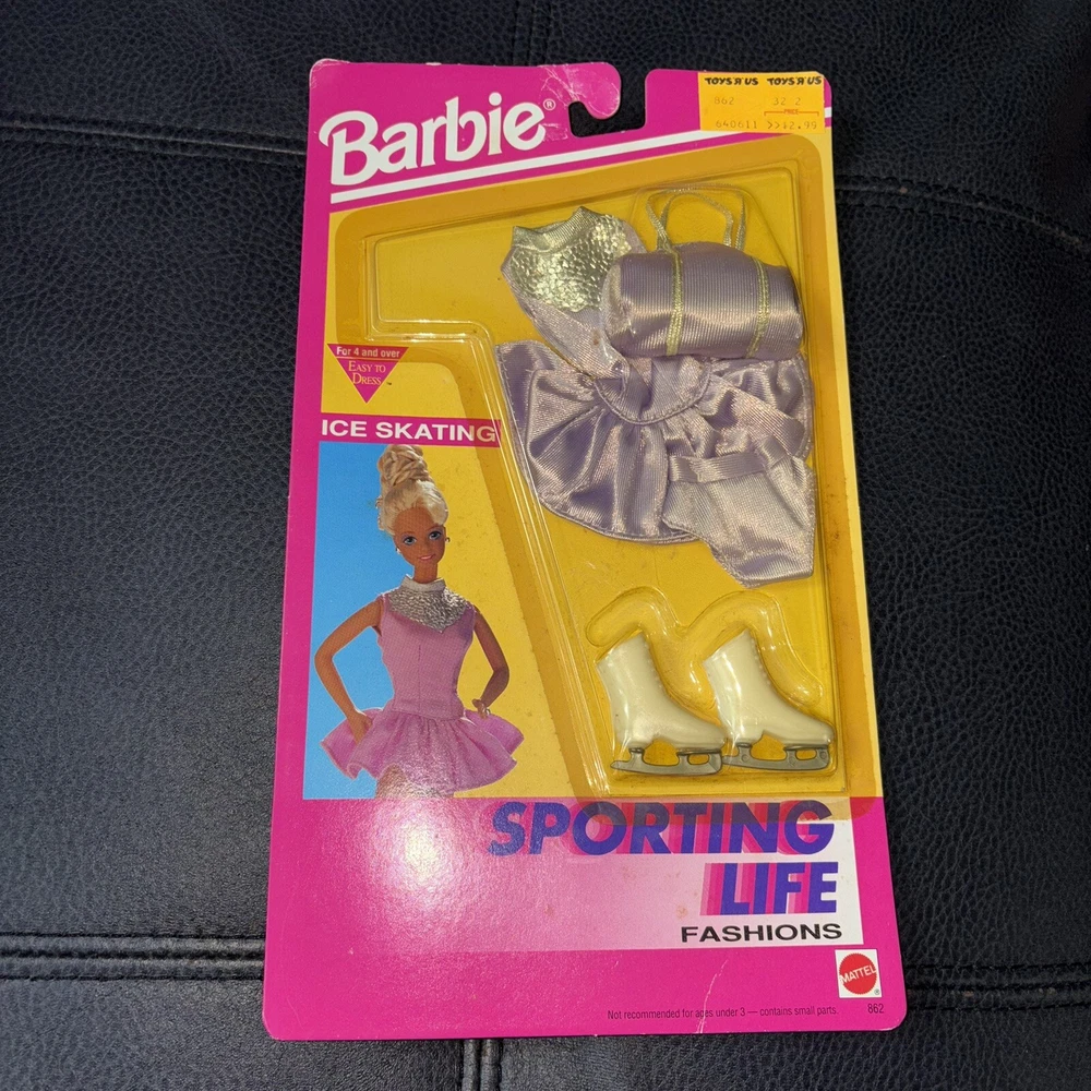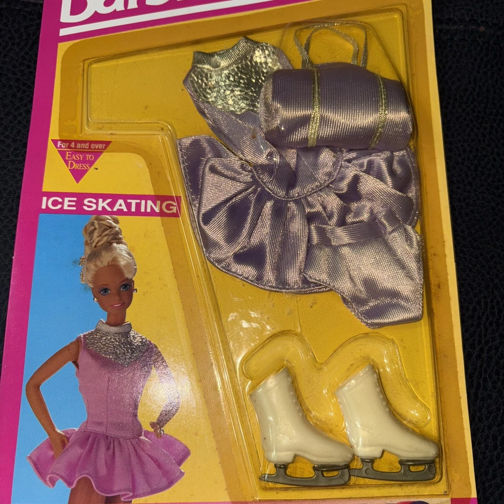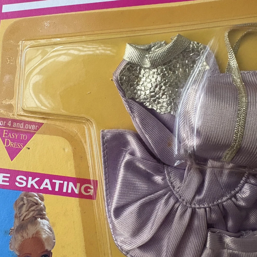 This is a vintage 1992 Barbie Fashion Doll clothing set called "Barbie Sporting Life Fashions Ice Skating." It includes 4 pieces: an ice skating dress, an outerwear bag and ice skates, and is designed for all occasions. The multicolor outfit is part of the Skating product line, featuring a sport theme for Barbie dolls. Made by Mattel, it reflects activewear, outerwear, and special occasion clothing styles. New but lost color Was purple now very light purple Skates no longer white